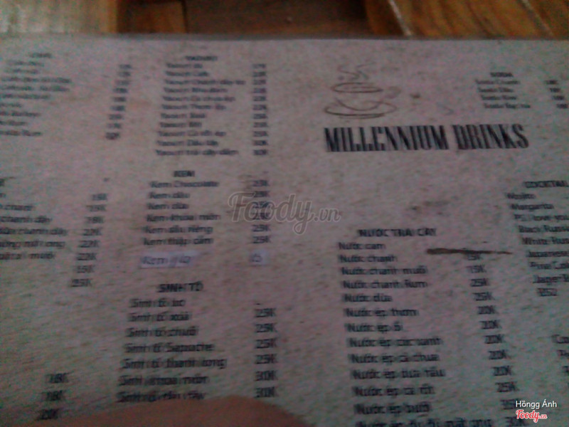 7.0Millennium CafeQuán có không gian ngoài trời .trong thì chia ra ngồi bệt với bàn cao .thiết kế quán đa số là gỗ .không gian rất ấm áp và dễ chịu nhưng chắc không phù hợp với mùa hè.hình như cô chủ cũng lớn và thân thiện .thức uống cũng đa dạng và phù hợp giá cả . ...Xem thêm