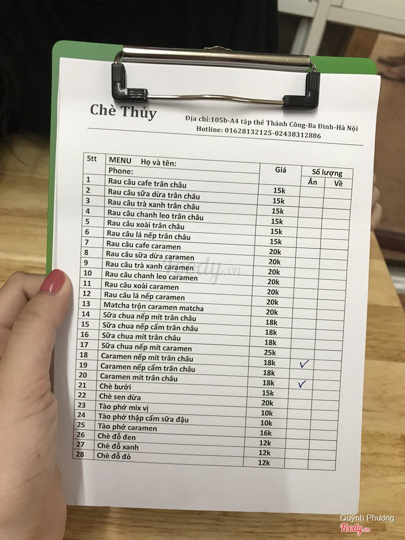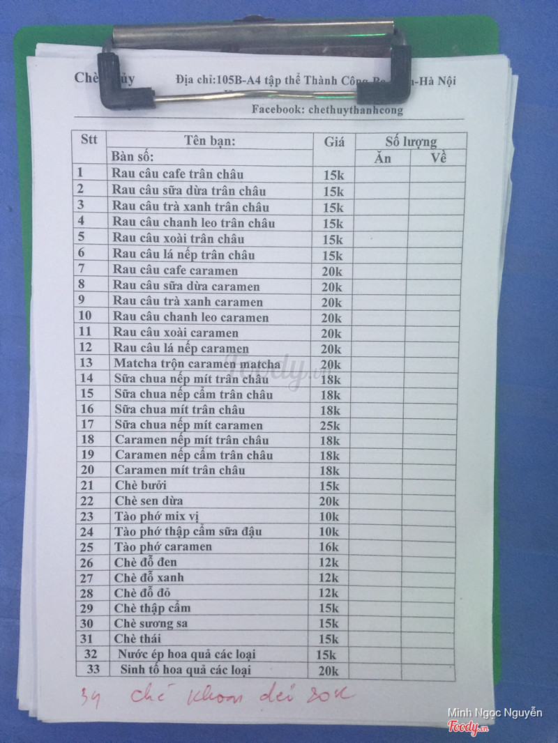 6.4Chè Thuỷ - Thành CôngĐược anh cùng công ty giới thiệu nên gọi ship thử về ăn. Giá cả : từ 15-30K/ 1 cốc tùy loại chè. thực đơn cũng đa dạng nhiều món. Chất lượng : chè không quá ngọt tuy nhiên không quá đặc sắc, chè bưởi mình thấy nhiều vị vani quá nên ăn không thanh, nhìn chung là cũng được. Phục vụ : ship nhanh và tận tình ...View more