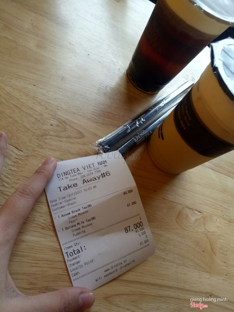 Đây là lần dầu tiên mình đến dingtea. Quán nằm đối diện với trường đại học thương mại. Decor rất đẹp, không gian yên tĩnh rất thích hợp để học tập. Mình và một đứa bạn gọi một hồng trà và một trà sữa oolong. Trà oolong của mình cũng ngon. Mình có thêm topping cream cheese nhưng có lẽ mình uống không hợp lắm bởi cream cheese mặn một cách kinh khủng, mà mình chẳng thấy vị béo ngậy của nó đâu cả (chắc do khẩu vị của mình thấy thế). Hic giá cũng mắc nữa, có lẽ chắc phải có dịp thì mình mới quay lại. ...Xem thêm