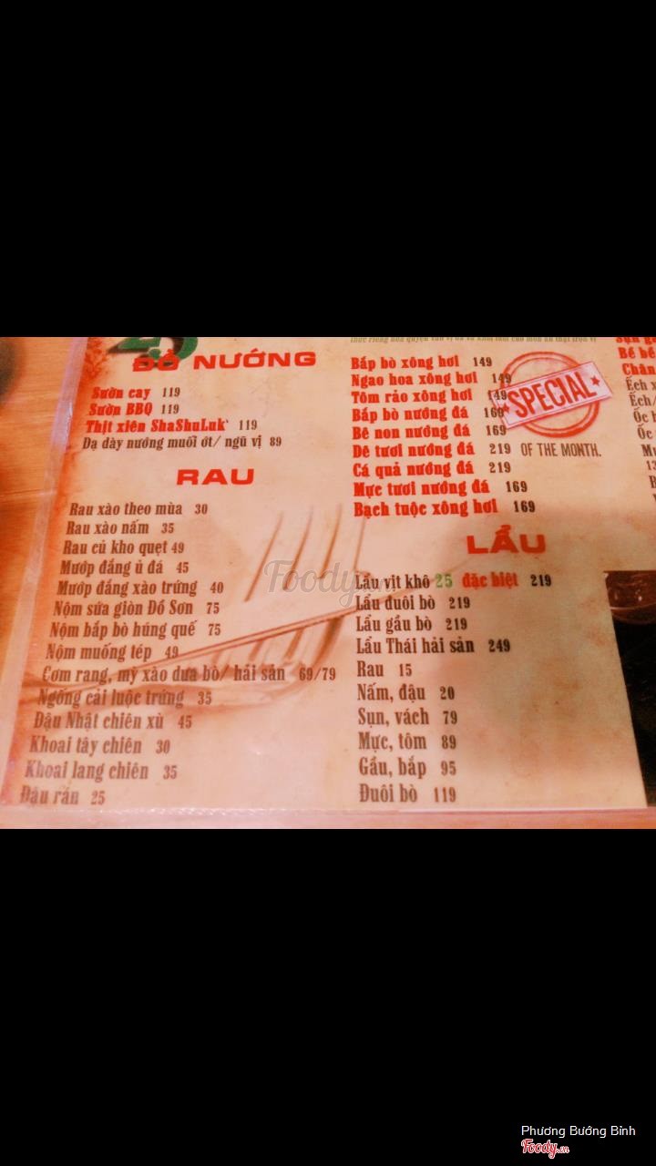 6.4Lẩu bò thả gaThấy quán có chạy chương trình lẩu bò mỹ thả ga. Cả nhà cũng tí tớn đi ăn. Buổi trưa nên quán không quá đông. Nước dùng ngon và đặc biệt ăn bò thả ga thật sự. Nhân viên thì hơi chậm. Gọi thay ga phải đợi lúc lâu. Đồ nhúng thì khi gần hết bạn gọi luôn ngồi đợi tí là vừa. Bò ngon. Ăn hoài không chán luôn. Đồ nhúng như mì hay rau cũng thoải mái. Nhâm nhi mấy cốc bia nữa là tuyệt vời Ngồi bên ngoài đỡ hơn. Nhà mình ngồi bên trong hơi nóng với bí. Thật sự không thích anh bảo vệ cho lắm. ...Xem thêm