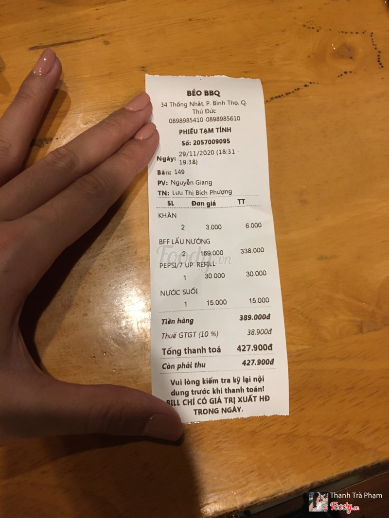 3.2Đau đầu quá nhiềuMình đi cuối tuần, quán rất chi là đông và ồn ào kinh khủng khiếp. Tiếng nhạc xập xình, tiếng người nói chuyện, tiếng trẻ con do các phụ huynh dắt theo khóc la hét om sòm, tiếng chén dĩa nhân viên dọn từ trên lầu xuống rửa quăng bộp bộp (do mình ngồi ngay lối lên cầu thang nên mọi âm thanh từ khu vực thay vỉ nướng, dọn chén dĩa đều lọt vào tai hết) rồi còn có cả 1 bàn lớn vào nhậu nhẹt 123 dô dô... Cuối tuần đang vui vẻ, thấy quán đông cũng ghé vào ăn vì biển hiệu là quán nướng BBQ, ai ngờ cũng là quán nhậu, nếu ko muốn nói là xô bồ. Không gian rất ngộp vì ko có máy hút khói nên khói thì thôi luôn, trang bị 2 cái quạt máy thổi khói, chán lắm. Nhân viên phục vụ khá tốt, nhanh nhẹn, nhân viên giữ xe thì ko, có vẻ khó chịu. Vệ sinh: nói thật là mình thấy hơi bẩn. Mặt bàn bám dầu mỡ nhiều, do bên dưới full bàn nên mình là 1 trong 2 bàn khách trên lầu đầu tiên nhưng lại ko sạch??? Tay vịn cầu thang rất bẩn ko nên chạm vào, mình cầm vào cái hết hồn vì dơ nhớt nhớt kinh lắm í. Đồ ăn thì mình thấy rất bình thường, thịt, cá, tôm mực (ko tươi), bò lá lốt, sò các loại, rau, có một số món ăn kèm như gỏi cuốn, súp, bánh hỏi, mì xào, gỏi v.v.v. Có cả đồ tráng miệng trái cây và tất cả đều tự phục vụ. Buffet lấy thừa trên bàn ko ăn hết thì 100gr phạt 50k. Điểm trừ lớn nhất hôm nay là không gian kinh khủng và bonus thêm trời mưa, nên mái che bên trên kéo vào. Mình ngồi trên lầu ko bị ảnh hưởng nhưng nét mặt của các bàn ngồi bên dưới khó chịu thấy rõ, lí do là mái che kéo vào ko đc mượt, bị giật giật, bao nhiêu bụi và lá cây đua nhau rơi xuống bàn ăn của mọi người bên dưới, cảm thấy thật là ko muốn ăn nữa luôn. Giá: cuối tuần 169k chưa gồm thuế, uống nước ngọt pepsi fill up 30k chưa thuế nhưng là pepsi chai to 1.5 lít đổ ra chứ ko phải pepsi tươi đâu ạ. Lần đầu cũng là lần cuối. Ko hiểu sao quán lại đông vậy, chắc ko phải gu mình. ...Xem thêm