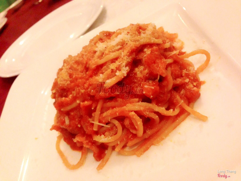 7.2La Hostaria - Món ÝI scanned the Italian food recommendations and decided to give La Hostaria a visit. I arrrived a little on the late side – about 9 p.m. Immediately, the restaurant visuals struck us as perfect! White table cloths. The appetite-generating red-colored napkins and walls were lovely. A wonderful first-impression. We considered the attractive menu options and selected 3 dishes: - Insalata Caprese - Risotto al Gorgonzola e veli de Speck (risotto with gorgonzola & Speck slices) - Tagliatelle nere ai Gamberi (black ink Tagliatelle with shrimp) The risotto was, in a word, NGON (delicious)! I love risotto. I imagine that had it still been hot, it might have been over-the-top. The risotto cooked to perfection, the smoked ham slices served in generous portions and delicious. The gorgonzola cheese very very nice. The shrimp tagliatelle was okay. Again, as the dish had lost its warmth, any wonderful impression it might have been able to make on us was also lost. If we were to return, we wouldn’t order this dish again. We enjoyed our two glasses of Merlot and didn’t dare extend the dining experience by ordering dessert. ...Xem thêm