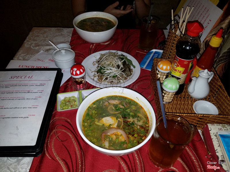 8.6Trưa có bún bòQuán vốn là nhà hàng Ý, decor kiểu Ý. Nhưng muốn ăn bún bò máy lạnh tô chất lừ thì nên vào đây. Ánh sáng mờ ảo. Máy lạnh mát rượi. Và tô bún bò lớn 50k nhưng chất lượng ngập trời. Tô siêu to. Siêu nhiều thịt. Nêm nếm cũng ngon. Vì phục vụ là của quán thực phẩm Ý nên rất lịch sự và nhiệt tình. Có loại chả bì xoắn ốc nhìn rất hay. Tô bún bò đầy đủ gồm giò heo hầm nhừ nên rất dễ ăn, chả quế, chả cây, chả xoắn, bò miếng, v.v... Cái tô đủ lớn để muỗng cũng xém chết chìm trong đó. Nêm nếm ổn và đậm đà. Bạn ko làm gần đó mà giới thiệu chắc mình cũng ko biết luôn. Để một bữa tối nào đó quay lại ăn thử menu Ý. ^^ ...Xem thêm