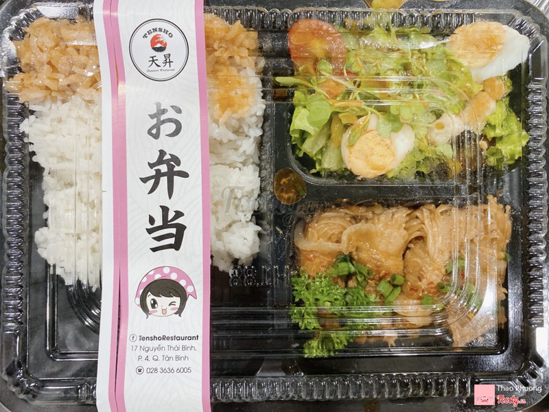 8.0Tensho - Cơm obentoMình đặt 1 phần cơm Obento Lườn cá hồi nướng qua Now. Shipper giao rất nhanh. Lúc nhận đồ ăn mình cũng hơi bất ngờ vì quán gói hộp cơm bằng khăn chỉn chu như kiểu Nhật. Hoá ra quán có chương trình thu thập đủ 5 khăn này là sẽ được freeship lần sau. Mà mỗi lần là 1 loại khăn khác nhau nên giữ lại kỉ niệm hoặc tái sử dụng cũng được nè. Phần cơm khá nhiều với đứa con gái như mình thì ăn no lắm. Lườn cá hồi nướng mềm thơm, sốt ngon, vừa đủ. Trong phần salad đi kèm có mỗi cái vụn bánh mì là ko được tươi thôi còn lại ổn hết. Có tăm và khăn ướt. ...Xem thêm