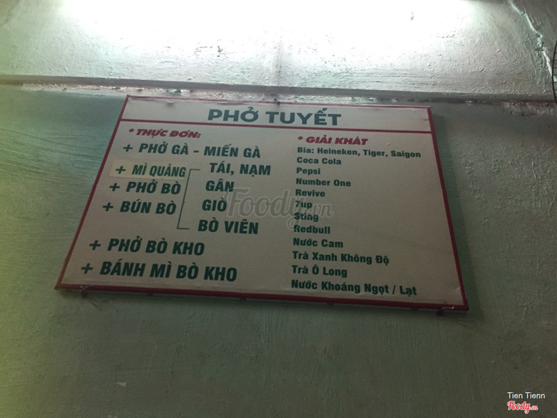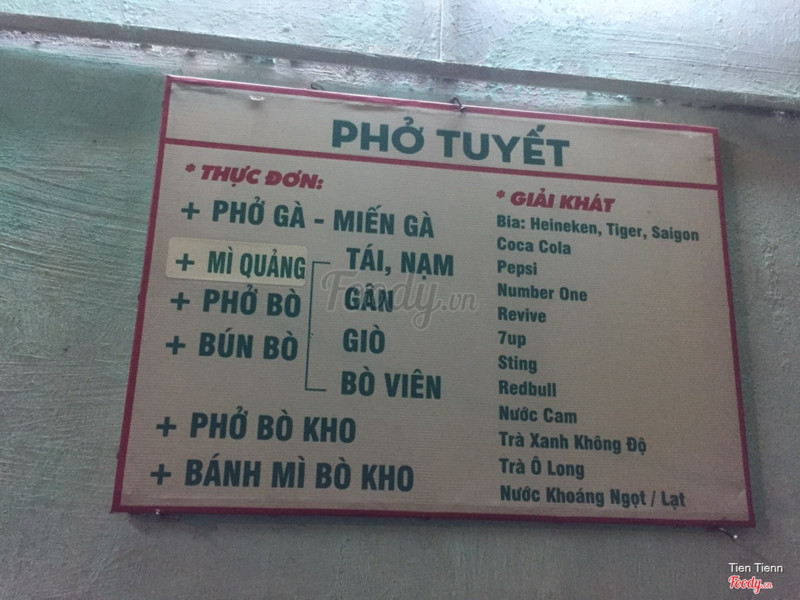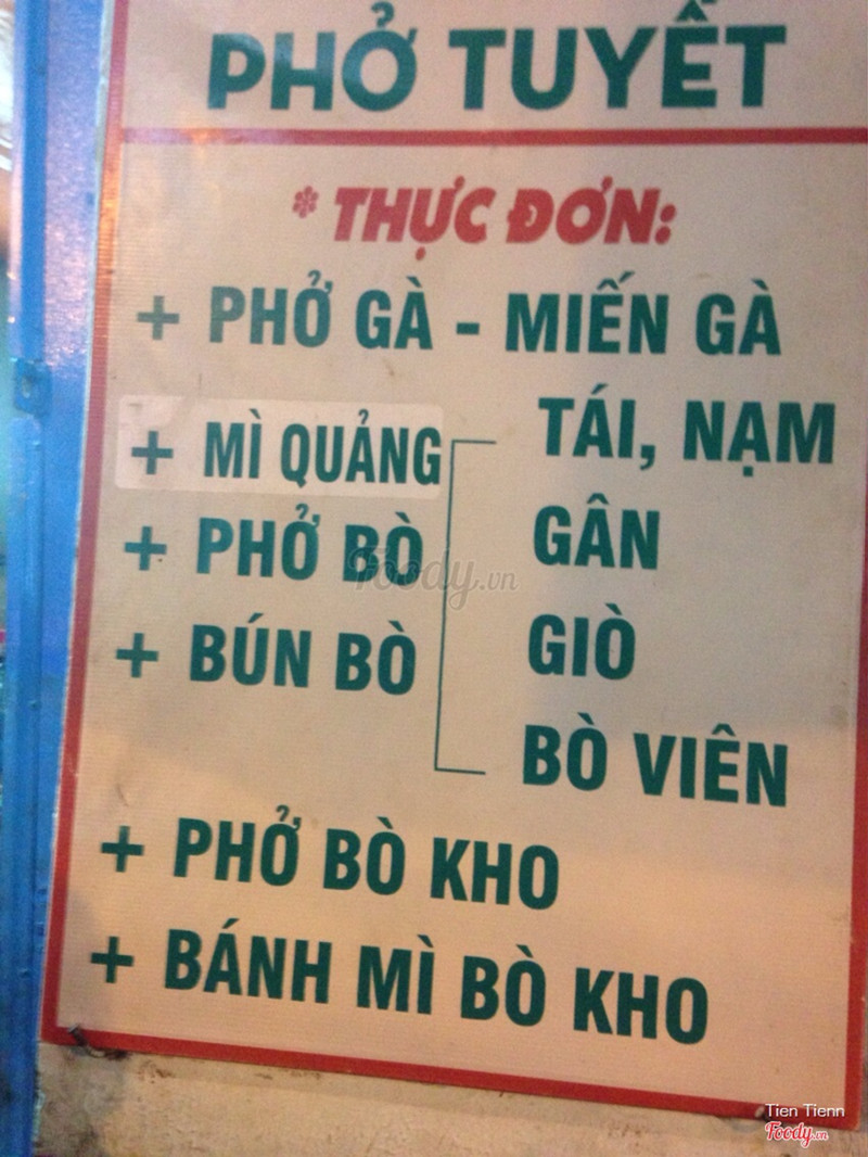 Quán phở này bán cũng hơn 20 năm rồi nên kinh nghiệm bán quán của cô Tuyết có rất nhiều. Cô bán rất nhiều món như phở , bánh mì bò kho, bún, phở bắc, mì trứng, gỏi gân bò/ gỏi gà, ... từ món ăn no đến món nhậu có tuốt hết nhen. Mà chỉ bán buổi chiều từ 5h đến tối khuya thôi. Mình tới mua 1 bịch phở bắc nạm mang về được 1 tô đầy tràn. Giá 20k. Thịt nhiều ăn rất no, nhưng không mềm lắm. Không gian rộng rãi chỗ ngồi thoải mái thoáng mát. ...Xem thêm
