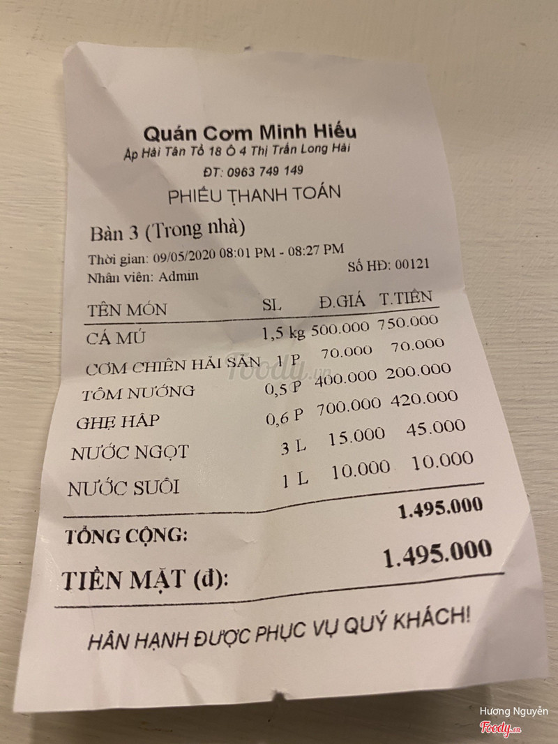 10Quán Minh Hiếu - Cơm, Lẩu & Hải SảnQuán cơm Minh Hiếu là quán ăn ở Long Hải đầy đủ các món Cơm, Lẩu, Hải Sản giá lại hợp lý. Có nhận đặt cơm các đoàn tham quan du lịch từ 6 - 500 người, giá cả rất là ok ạ Quán ăn Minh Hiếu có cơm bình dân, hải sản tươi sống, giá cả hợp lý, chủ quán rất vui vẻ. ...Xem thêm