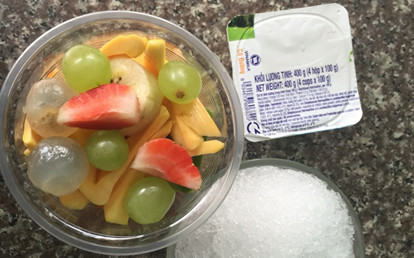 1 ly gồm: si rô, 2 trái nhãn, 2 miếng đu đủ, 2 miếng xoài chua, 1 miếng ...