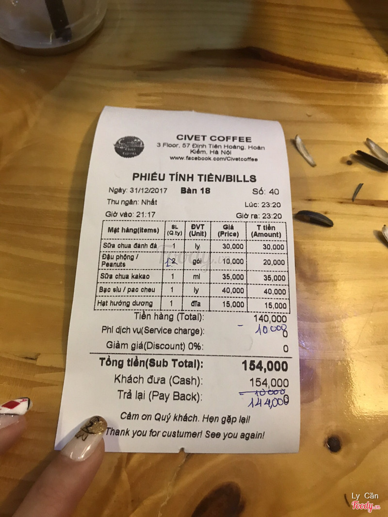 7.4Civet CoffeeNgồi ở đây từ hồi cái tên cũ mà chả nhớ nổi, thích cái view thoáng của quán. Lối đi lên là chỗ hàng nộm í, cứ tự tin mà xông vào leo lên tầng 3 nhé. Mình vô tình lên hôm giao thừa mà đông đến nghẹt thở. Không gian không có gì đổi mới, vẫn cũ kỹ đơn giản như thế. Đồ uống pha không ngon nhưng mà không tăng giá hay phụ thu nên yêu thương rồi. Tầm nhìn xa bị khuất cây to nên là chỉ ngó ra đường chứ không thấy đài phun nha. Nhân viên nhiệt tình, quan tâm khách. ...Xem thêm