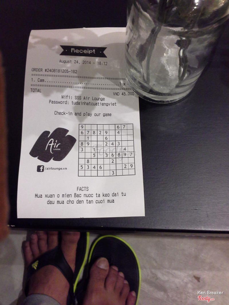 7.8Air Lounge CoffeeĐi ngang đây hoài mà mới có dịp ghé vào. Quán có không gian thoáng, rộng rãi, kính nhiều nên sáng sủa và tạo một tầm nhìn mở. Nhân viên thân thiện, nước uống pha chế ngon, bánh ăn bình thường. Có trò chơi sudoku trên bill, ai giải được thì được tặng cái bánh chuối cũng thú vị. ...Xem thêm