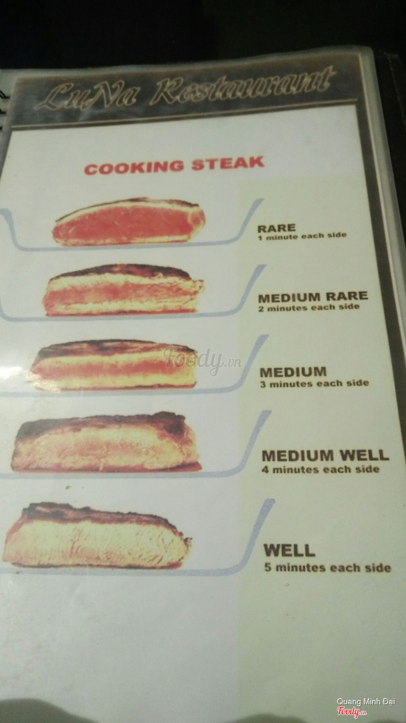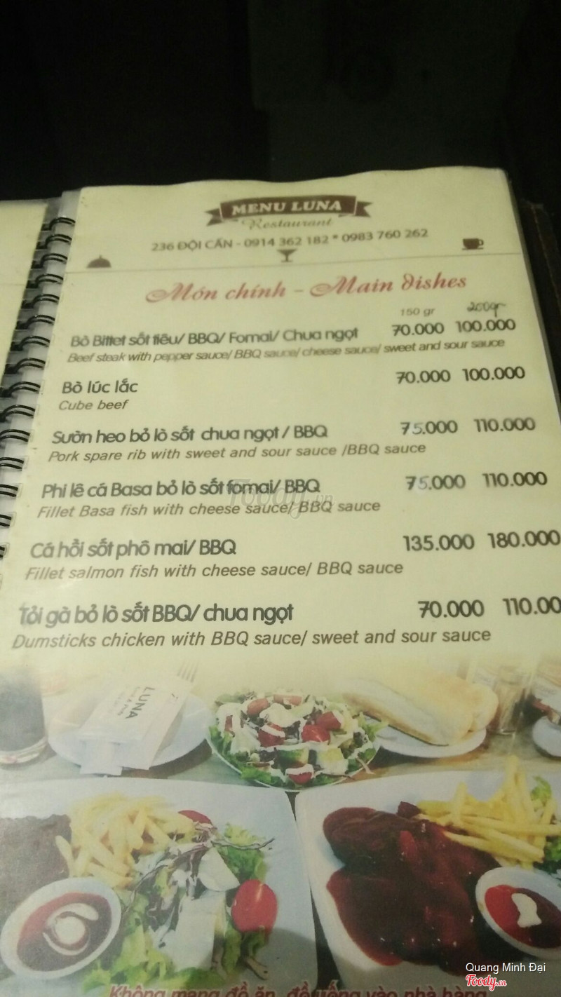 Tối 2/9 đi ăn bít tết nhà hàng Luna. 2/9 nên khá đông khách. Để chín nhanh đầu bếp khứa sâu lên mặt miếng thịt theo hình vuông như ta hay làm món mực xào. Thành quả bê lên là miếng thịt bò khô như giấy. Rất dễ tính tôi cũng không thể gọi nó là món bít tết được. Và dù được bạn bè động viên tôi cũng chỉ nhằn được vài miếng rồi bỏ lại cái món bò thái viên dính liền ấy. Hẳn rằng, nhà hàng Luna cho rằng người dân Việt giờ vẫn không biết thế nào là món gốc Tây beef steak. Bưng lên thế nào chúng nó cũng phải ăn. ...Xem thêm