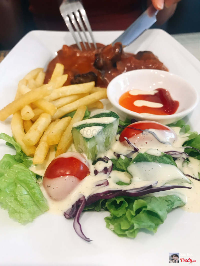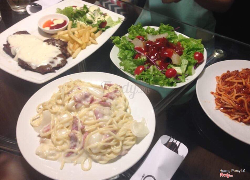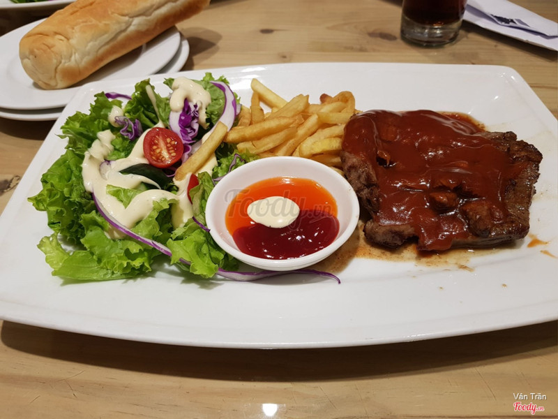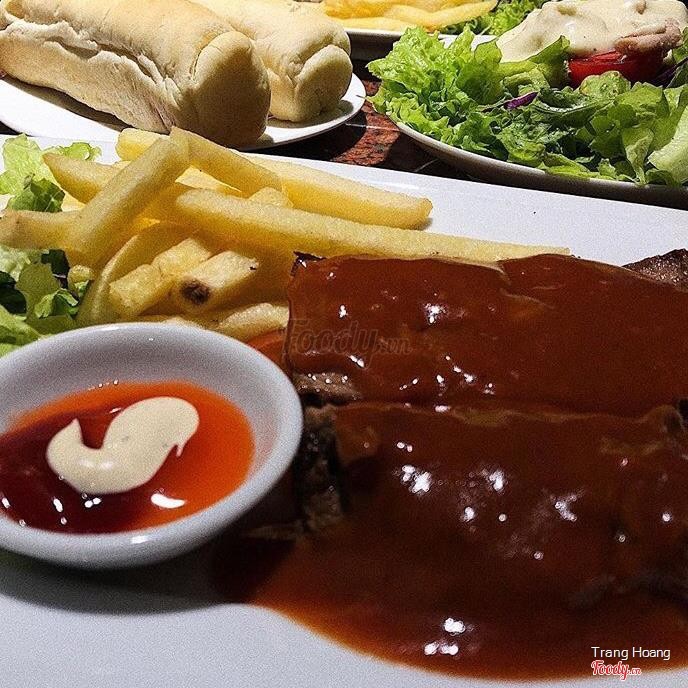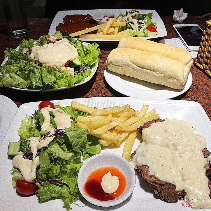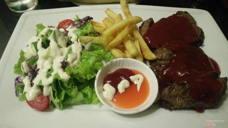 Là một tụ điểm rất hợp lý cho những bạn muốn ăn steak nhưng k có điều kiện ra nhà hàng như mình nhé :)) quán có 2 tầng k quá rộng nhưng các bàn xếp xan xát nhau nên cũng có nhiều chỗ phết. Hôm mình đi quán khá đông nên lên đồ hơi lâu nhưng ăn rồi thì thấy chờ 1 chút cũng là xứng đáng. Mình có gọi 3 vị steak là bò phô mai, bò tiêu đen và bò sốt bbq. Trong cả 3 thì mình thích bò phô mai nhất chắc cũng vì mình là con ghiền phô mai nữa. Ở đây các bạn có thể chọn độ chín cho steak nhé có 5 mức tất cả. Mình k thích chín quá cũng k thích tái quá nên mình chọn mức 3 và ăn thấy rất ưng nhé thịt mềm và vẫn còn hơi ẩm ẩm. Bạn mình dùng mức 2 thì thịt sẽ vẫn hơi hồng hồng nhưng ăn k có cảm giác bị sống hay gì chỉ là do mình bị ám ảnh màu sắc nên mình sẽ chọn mức 3 :)) Bò sốt tiêu và sốt bbq ăn cũng rất đậm vị chấm chút bánh mì nữa thì có mà vét hết đĩa. Bọn mình gọi thêm cả 2 mì là mì kem với mì sốt bò bằm. Mì kem k quá ngậy ăn rất vừa, mì sốt bò bằm thì vừa thơm vị tiêu và điểm cộng lớn cho 2 món mì đó là rất nhiều thịt :)) Quán có nhiều món đa dạng như sườn, cừu, cá hồi, phi lê,... để mọi người chọn. Giá cả thì siêu hợp lý cho các món âu như steak và pasta nha. Nên nếu bạn cũng thích các món đồ âu thì có thể đến thử quán này nha. ...Xem thêm