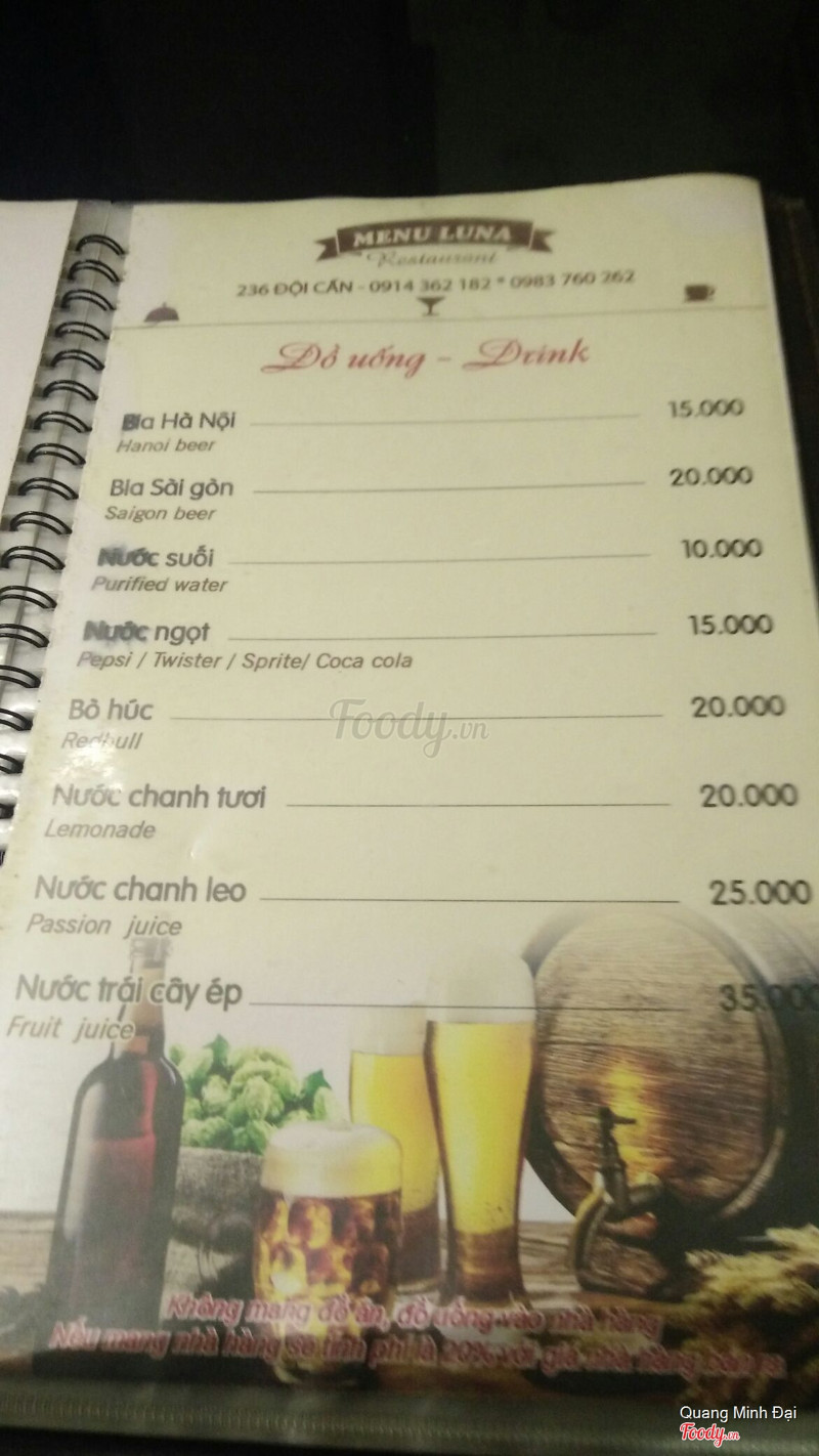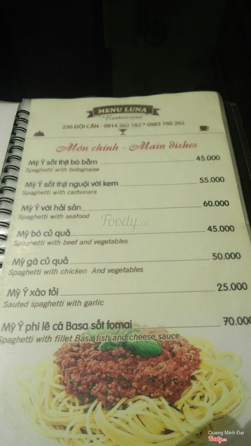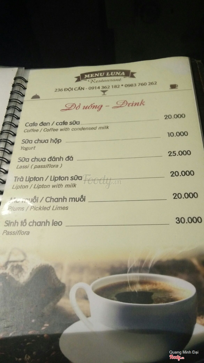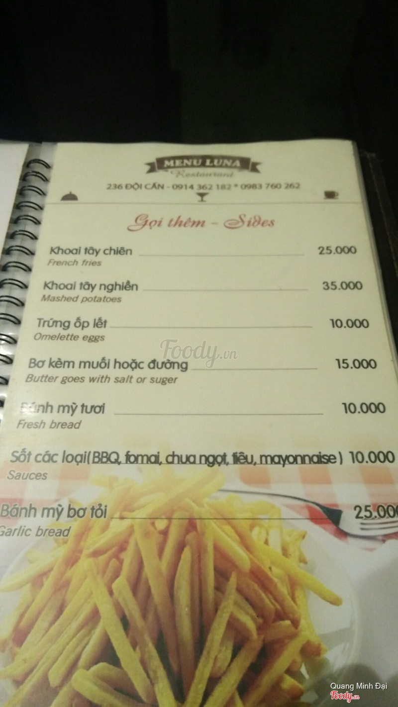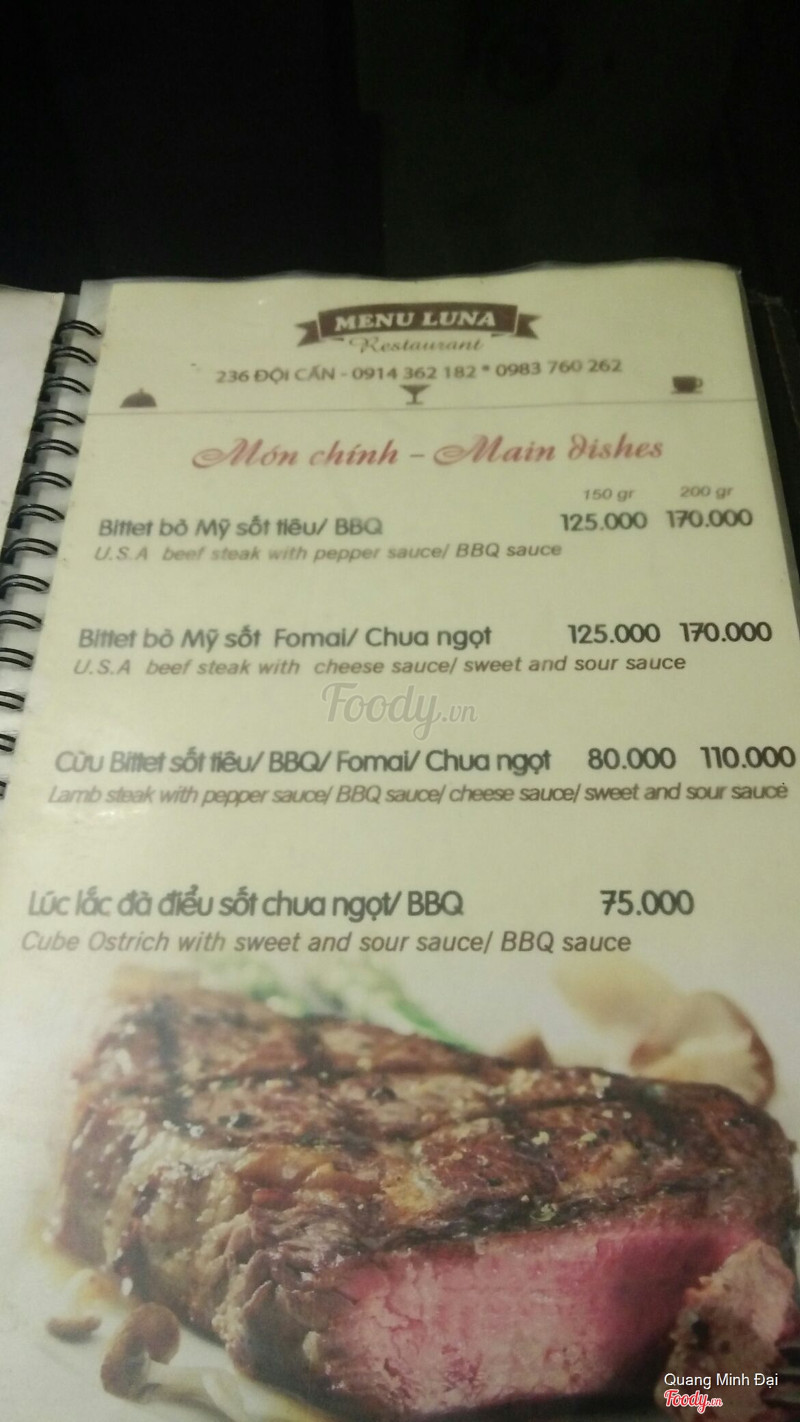 Luna Steak Pasta Đội Cấn. Steak giá rẻ bình dân cho mọi lứa tuổi. Vị trí ngay trên đường Đội Cấn nhưng vì quán khá nhỏ nên nếu đi lần đầu thì phải để ý kỹ mới thấy, vỉa hè để xe bé nên mình đi ăn là cứ tự động để xe ở trong sân của cái cơ quan gì đó gần đấy 100m, có sân rộng và người trông xe yên tâm, khi về nhớ lấy vé từ Luna để không bị mất tiền vé trông xe. Về đồ ăn thì đúng là tiền nào của nấy, chất lượng sẽ không bằng được những nơi chuyên nghiệp nhưng so với giá cả như vậy là ổn. Chỉ là các bạn nên gọi hẳn thịt chín luôn vì đầu bếp ở đây làm tái, chín vừa, chín,... không chính xác đâu nên nếu gọi tái chín thì có khi thịt vẫn còn sống ấy. Nước sốt thì mình thấy có bbq và phô mai thì ok còn chua ngọt và tiêu đen thì chán, nhạt nhẽo lắm. Ngon nhất với nhìn ổn nhất thì lại là mỳ Ý thôi. Vì quán bình dân nên đi ăn mình chỉ gọi mỗi bò thôi chứ chưa tin tưởng lắm mấy món thịt cừu, đà điểu hay cá. Về nhân viên thì không được chuyên nghiệp cho lắm, cảm nhận chung thì đúng kiểu chỉ là các bạn thanh niên lao động kiếm việc làm chứ không phải là sinh viên đi học đi làm thêm nên cách giao tiếp của các bạn khá kém và vô duyên, mất cảm tình lắm. Nhưng dù sao thì giá tiền vẫn hợp lý. ...Xem thêm