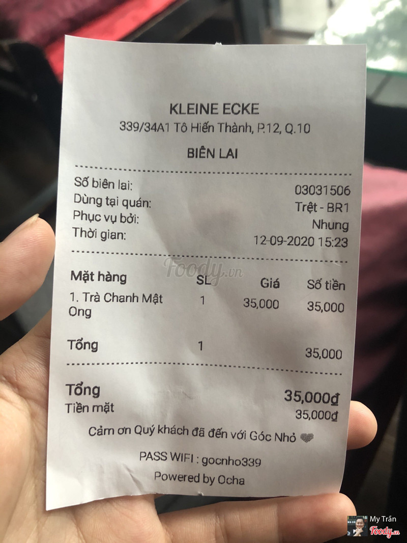 8.0Kleine Ecke Cafe - Tô Hiến ThànhDù là khách quen ,kêu 1 ấm trà nho đen vị bạc hà,ngon đấy,hơi tiếc là 1 bình trà 90k,nhưng nước trong bình chắc chưa tới nửa bình.nên nhìn cái ấm tí nước nên hơi hụt hẫng.nếu với dung tích ít quán nên dùng bỉnh nhỏ,phục vụ thì nhiệt tình , k gian thì khỏi bàn cũng mát mẻ. điểm trừ,cầu thang lên tầng cảm giác mong manh quá.ghế ngoài ban công trên thành ghế dính cái gì trắng trắng, dòm cứ như phân chim, nên mãi k dám dựa lưng vào,bạn mình dựa vào dính hết vào áo.gop ý quán chú ý vấn dề này ...Xem thêm