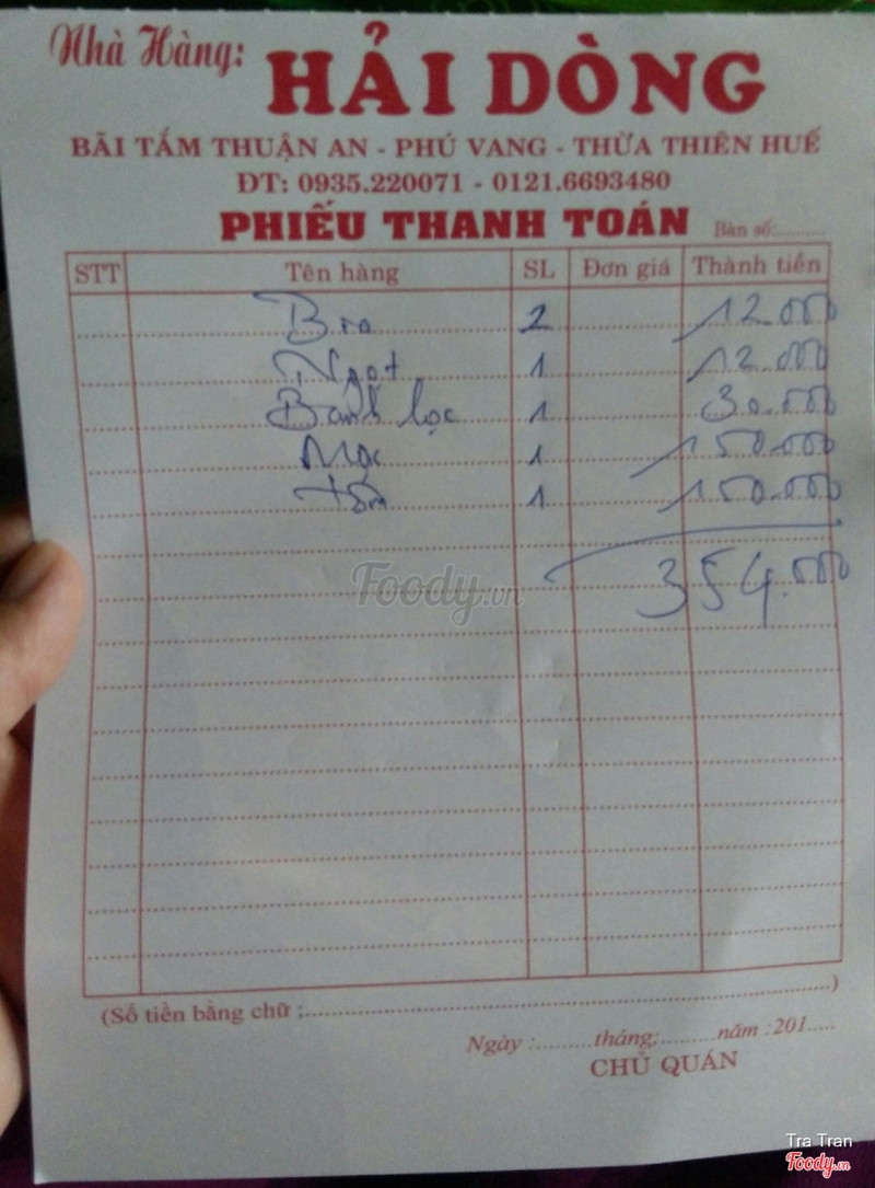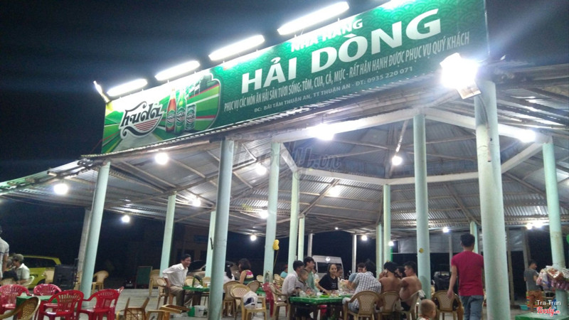7.6Hải Dòng - Hải Sản Tươi Sống15.05.2017 Nhà hàng Hải Dòng Bãi số 3 biển Thuận An, huyện Phú Vang, tỉnh Thừa Thiên Huế Pass wifi: 12345678 Tính đi biển lúc chiều mà trời mưa. Đợi mãi đến 18:00 mới tạnh. Thôi cứ ra đó ăn chơi, chứ giờ này tắm biển gì nữa. Từ nhà bà ngoại ra biển hết 30-40 phút xe máy. Sau một hồi lượn quanh tìm chỗ đậu xe để ra biển mà k0 có, bọn mình vào luôn nhà hàng này. Mặt tiền nhà hàng là bãi biển, nên trong lúc chờ món có thể ra nghịch cát chút, chứ đen kịt thế này tắm làm gì, nhỡ sóng cuốn đi mất xác. Nhà hàng to rộng, trần cao, mở bốn bề nên rất thoáng. Có khu lựa hải sản, khu tăm nước ngọt + rửa chân tay cho khách. Có 2 đứa ăn nên chỉ gọi tôm hấp + mực nướng thôi, trên bàn còn có địa bánh lọc cho khách tự xử. Ngồi đến độ 20:00 rồi về thành phố chơi tiếp. Thiệt hại: 354k / 2 người ...Xem thêm