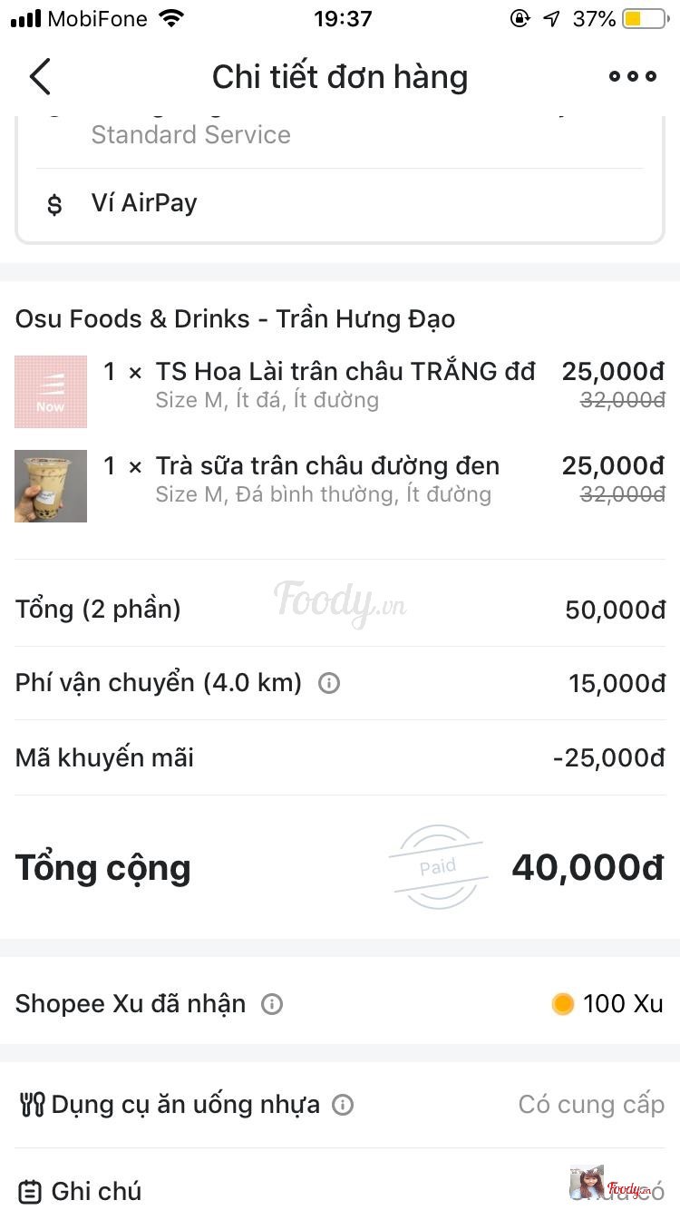 1.0Osu Foods & Drinks -***Đặt 6 món ts trân châu đường đen, 1 ts bánh flan mà lại lấy trân châu thường, uống lạt lẽo, ko có 1 tí vị đường đen, gọi đt báo quán thì ko giải quyết. Đã uống nhiều lần, lần này đặt cho công ty uống thử thì làm quá thất vọng . ...View more
