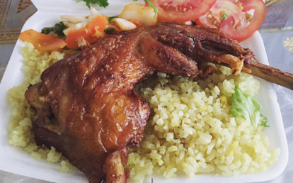 oanhoanhHướng sau lưng mẹ nhu rẽ vào đường huỳnh ngọc huệ, rẽ phải ngay hẻm đầu tiên. Quán bán vỉa hè thôi mà đông khách lắm. 35k 1 xuất cơm gà quay. Nguyên 1 cái đùi bự chảng luôn, phải 1/4 con gà luôn ấy. Cơm được nấu bằng nước luộc gà với màu nghệ nên có màu vàng rất đẹp. Cơm tơi xốp ăn giống cơm rang trứng. ...