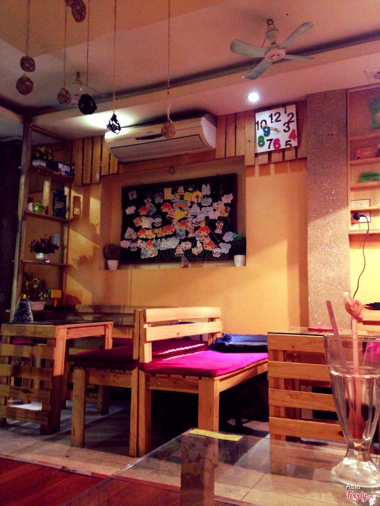 8.6Ngon và hấp dẫn quáQuán rất dễ tìm. Đi từ Phạm Ngọc Thạch rẽ vào Đẵng Văn Ngữ 1 đoạn là thấy, quán ở bên tay phải. Quán nhỏ nhắn dễ thương. Chỉ có 1 tầng. Có bàn ghế gỗ bên trái và cả chỗ ngồi bệt cùng nhiều gối ôm bên phải. Mỗi bàn đều có 1 bình hoa con con rất xinh. Tường trang trí khá giản dị, nhìn thân thiện. Đèn đóm ở đây kiểu mờ mờ ảo ảo. à đặc biệt là quán có 1 kệ để 1 đống đồng hồ bé nhìn rất xinh. Quán có wifi, và pass dán trên mặt bàn Có điều hòa và quạt trần mini và cả phòng wc. Có chỗ để xe ngay trc cửa. Vì quán mới mở nên còn vắng, ngồi rất thoải mái. Khá là yên tĩnh. Đồ uống thì ngon tuyệt cú mèo luôn. Mình gọi cookie Việt Quất, còn bạn mình gọi chocolate mint uống rất ngon :3 mà cốc lại đầy đặn. Uống no luôn ^_^ Trong lúc đợi sẽ có phục vụ nước lọc :))) Quán còn có cả đồ ăn nữa, mà mình chưa ăn thử, có pizza do chủ quán tự làm, mỳ ý các thứ, ... :D Giá cả rất được. Có thể nói là rẻ hơn mặt bằng chung 1 chút xíu. Cookie việt quất của mình có 27k. Chủ quán là 1 cặp vợ chồng mới cưới. Mình chỉ mới gặp anh chồng, rất thân thiện và chu đáo :D dắt, quay xe hộ khách luôn :D trời mưa còn ra cất mũ bảo hiểm hộ và cho mượn khăn lau yên xe. :D Nói chung là mình cực kết quán này. Đây sẽ trở thành địa điểm tụ tập mới của mình và hội bạn. ^_^ ...Xem thêm