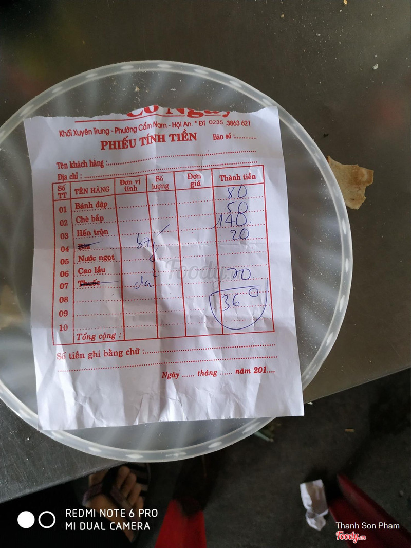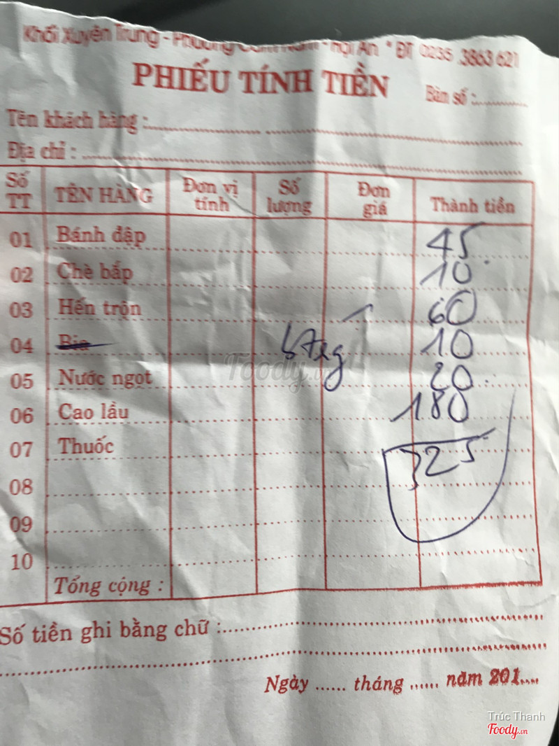 1.0Quán Có Ngay - Hến Trộn & Bánh ĐậpMình ăn ở đây 1 lần khi đi Hội An. Mới vào quán, có 1 cô phục vụ lớn tuổi hỏi ngay Mình "Ăn gì??" Mình vẫn vui vẻ đáp lại. Bánh đập và hến xúc cũng được. Hến không có gì đặc sắc, bánh đập thì ngon bởi nước chấm của nó. Sau khi ăn xong Mình có bảo tính tiền, gọi gần chục lần thì Anh nam phục vụ mới trả lời, mặc dù đang đứng rất gần Mình... Thái độ rất chảnh và hời hợt!!! Mình gọi 1 phần bánh đập, 1 hến xúc và 1 chai bia. Tổng cộng 75.000. Lúc tính tiền không có hoá đơn, không minh bạch! Bạn Mình trước đó mấy ngày có đi ăn cùng với gia đình thì giá lại khác?? Mình đọc trên Foody có những bình luận thấy nhiều Bạn bị "Chém" đẹp. Nói chung, cách phục vụ không tôn trọng Khách Hàng, quá tệ. Thực sự thấy rất thất vọng về quán! ...Xem thêm