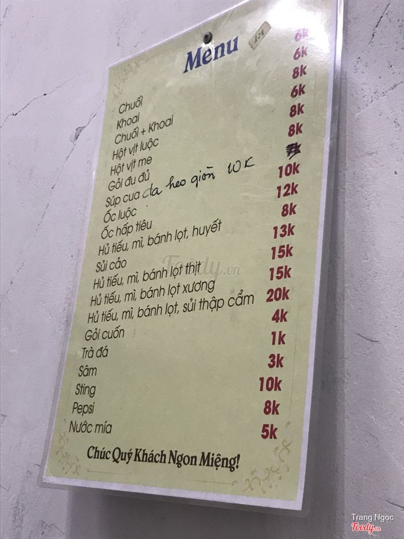 Quán mới sửa sang lại nên khá sạch sẽ. Mình ăn quán này từ hồi năm nhất tới giờ cũng được 3 năm rồi.Menu đa dạng lắm: hủ tíu, mì, bánh lọt, gỏi cuốn, hột vịt lộn, gỏi đu đủ... Tới quán này thì nhất định phải ăn hủ tíu mì khô vì quá ngon, thích món này nhất. Hột vịt rang me ăn cũng ngon vừa miệng. Quán khá đông, tầm 5h là có khi hết bàn luôn. Chủ yếu là sinh viên tới ăn. Ấn tượng nhất là có 1 chị tính tiền max nhanh kkk ...Xem thêm