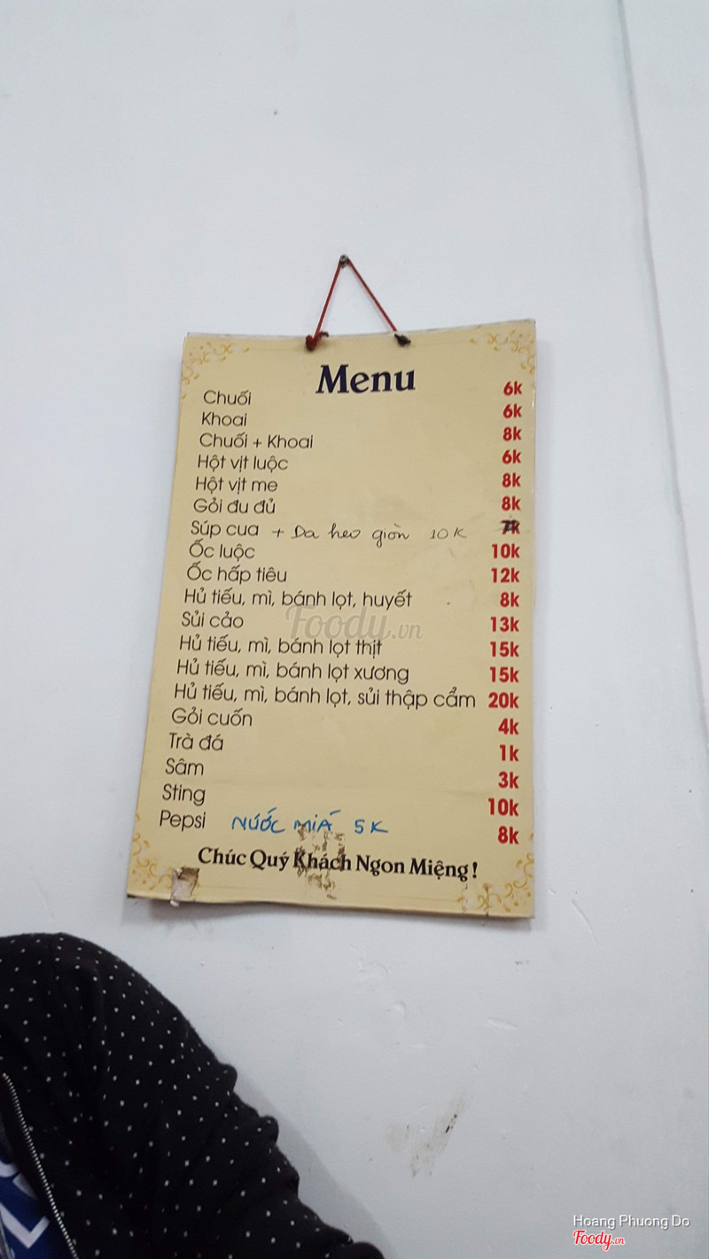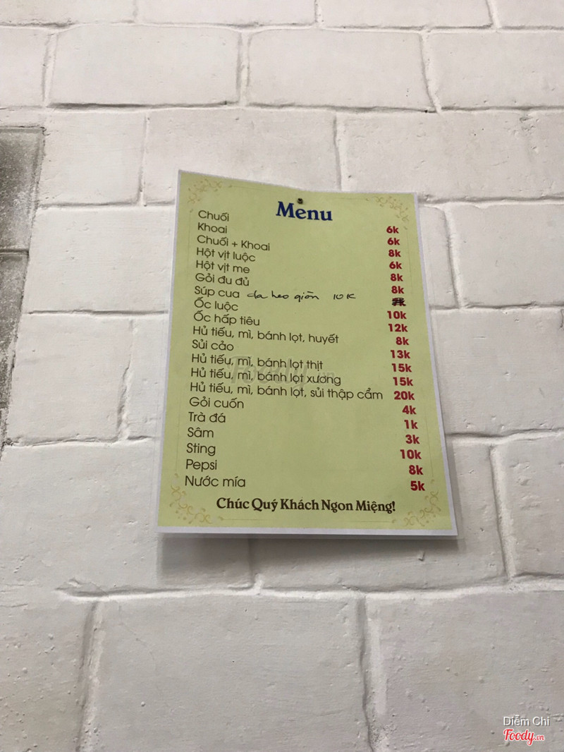 Vị trí: quán này nằm ở mặt tiền đường Lê Lai nè, ở đoạn gần với đường Nguyễn Việt Hồng(Lê Lai có 2 đường lớn nối với nhau), quán nằm ngay đoạn cua vuông góc luôn. Không gian quán phải nói là rất chật luôn, nóng nực nữa vì quán nhỏ xíu nhưng kê khá nhiều bàn ghế, khách phải ngồi chen chút nhau, nhất là giờ cao điểm thì ôi thôi nóng khủng khiếp luôn. Menu nhiều món ăn vặt lắm, như chuối luộc, khoai nướng nước cốt dừa, ốc luộc, hủ tiếu, mì... mỗi món tầm 7k - 15k thôi. ...Xem thêm