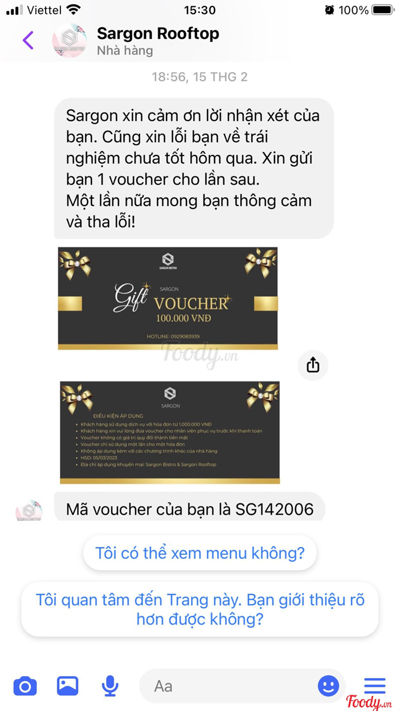 Một trải nghiệm quá tồi tệ cho ngày 14/2. Mình có đặt bàn 21h ngày 14/2 tại đây. Khoảng 21h15' mình tới nhà hàng, bạn nhân viên dẫn mình tới bàn ngồi. Điều tồi tệ thứ nhất là bàn chưa thèm lau và chưa decor như hình nhà hàng tư vấn, chỉ có mỗi bình hoa. Vào bàn ngồi có bạn lại hỏi về việc order, mình báo đã đặt trên fanpage trước đó. tới hơn 22h mình hỏi các bạn khi nào lên món thì các bạn phục vụ lại hỏi ngược lại mình đã order chưa? Xong mình có nói bạn phục vụ xuống báo quản lý giải quyết cho mình, mình không đồng ý dùng tiệc và yêu cầu hoàn cọc cho mình. Nhân viên không biết xuống có báo quản lý không, mình đợi thêm 15' nhưng không thấy ai lên cũng k báo lại gì, nên mình trực tiếp xuống nói chuyện với bạn quản lý về việc này. Mặc dù mình biết ngày này khách đông, nhưng bàn đặt trước mà cách phục vụ như vậy thì không thể chấp nhận được. Nhà hàng có xin lỗi và gửi voucher cho mình, nhưng mình thấy trải nghiệm 1 lần như vậy là quá đủ và không muốn đặt chân đến nhà hàng này thêm một lần nào nữa.Xem thêm- Đây là nhận xét từ Thành Viên trên Foody, không phải từ Foody Corp. -
