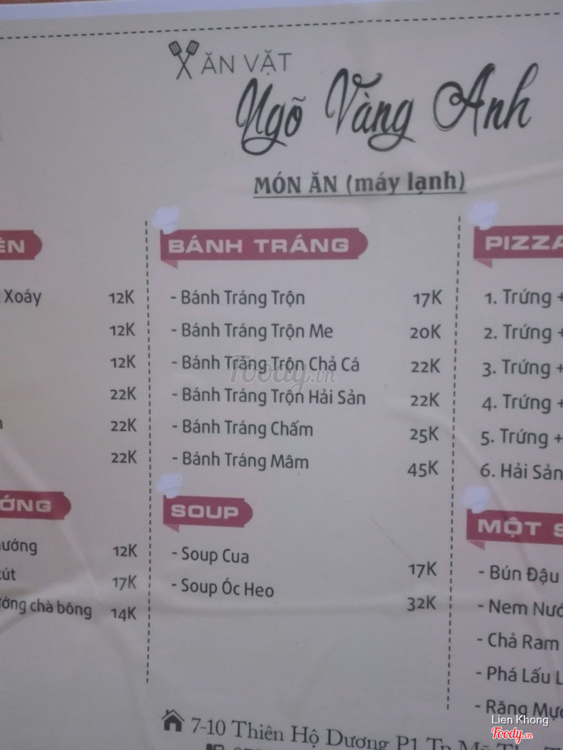 Mỗi khi nhớ Sg thì ghé Ngõ Vàng Anh ăn đỡ cũng được, nhưng nhìn chung thì giá hoặc mắc hơn, và chất lượng phần lớn là không bằng. Trà đào: nước đường mùi đào và miếng đào. Mình xui quá gặp miếng đào nhão nhẹt. Còn chất lượng khi bth thì không biết. Trà chanh thì bth,không đặc biệt. Nước sấu hay nước mơ gì đó quên rồi thì cũng bth,ko đặc biệt nhưng không dở. Tàu hủ đá thì hổ lốn kinh khủng toping gì cũng quăng vô ăn chung, nước đường bỏ gừng ăn nóng thì ngon chứ ăn đá thì biến thái dễ sợ được cái nhiều mà dở quá ăn hổng nổi thì nhiều như không. Súp cua: ngọt ngon kiểu Mỹ Tho. 7/10. Bánh tráng nướng/pizza Đà Lạt: ăn OK. Chỉ mắc thôi nếu so với đang ở Mỹ Tho. 7,5/10. Khoai tây lốc xoáy: biến thái quá khi khoai Tây phủ phô mai gì mà ngọt lịm, lại chấm tương cà tương ớt. Mình phải kêu riêng loại không phủ gì vì thiệt tình không tin chất lượng phô mai này. Hồ lô: yummy. Ăn kèm thêm rau răm dưa leo nên lành mạnh hơn. Bún đậu mắm tôm: mắm ngọt kiểu miền Tây. Bún là lấy bánh tráng cuốn lại cắt khúc nên ăn không đúng bài lắm. Và thật tế thì 5-60k ăn một mẹt bún vậy thì mắc quá. Tui ăn ở sg thì giá đó là ăn ở quận 1 quán tương đối đẹp rồi. Kết luận: thèm thì ghé ăn cũng được. Nhưng ở mỹ tho cũng bắt đầu có thêm nhiều chỗ bán ăn vặt kiểu sg nên sẽ cân nhắc. ...Xem thêm