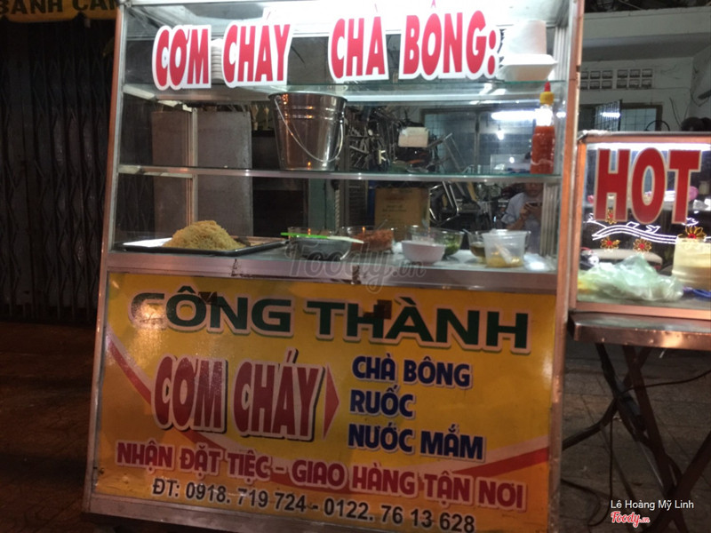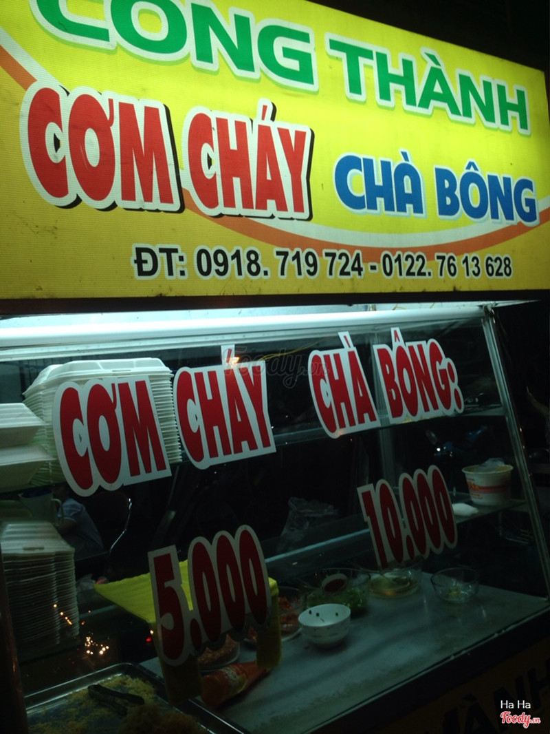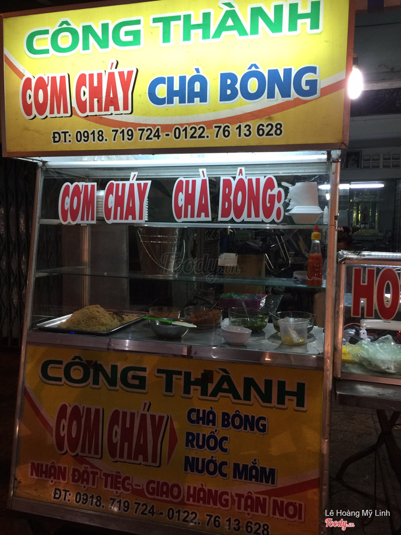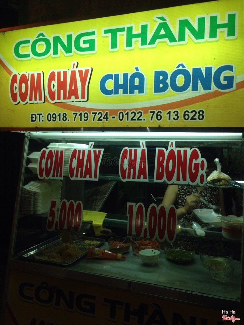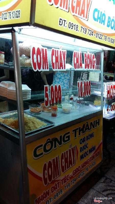 7.4Công Thành - Cơm Chay Chà BôngXe cơm cháy chà bông hiếm hoi còn trụ lại. Ngay ngã ba thành. Đi ngang qua không để ý là hay bị bỏ quên lắm. Vì gần đây có xe bánh mì, bánh bao này kia các kiểu, dễ bị nhầm. Cơm cháy giòn, ruốc, tép cho nhiều chan với mỡ hành, nước mắm ngon. Hồi trước 1 hộp 10 ngàn, giờ lên 12 ngàn rồi nha. Làm nhanh lắm, vèo 1 phát 1 phút 30 giây là xong, chẳng phải đợi lâu. Mình hay ra đây mua cơm cháy rồi đem vào quán nước ngồi ăn, nói chuyện ăn nhâm nhi bao hợp lí luôn. ...Xem thêm