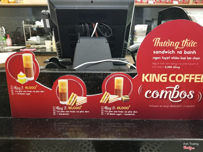 8.6King CoffeeQuán khai trương trong thời điểm hotnews vừa kết thúc. Mình vô tình đi ngang qua và thấy một quán mới đẹp khang trang trong khu biệt thự Bắc Linh Đàm nghĩ rằng sẽ quay trở lại. Vậy mà hôm đấy mất hết một tiếng đồng hồ để tìm lại Quán bởi vì không nhớ chính xác vị trí. Thật ra nó nằm ở ngay phía ra ngã tư hh, chỗ bidv thì rẽ trái. Quán set up rất hoành tráng sángđẹp nên chụp ở góc nào cũng thấy lung linh. Mình thấy nhân viên ở đây được traning khá kỹ. Mình vào đây hai lần rồi lần nào gọi đồ uống cũng thấy hài lòng. Nhất là những món thiên về cà phê Vị rất thơm ngon. ...Xem thêm