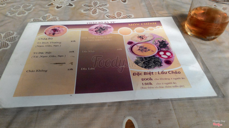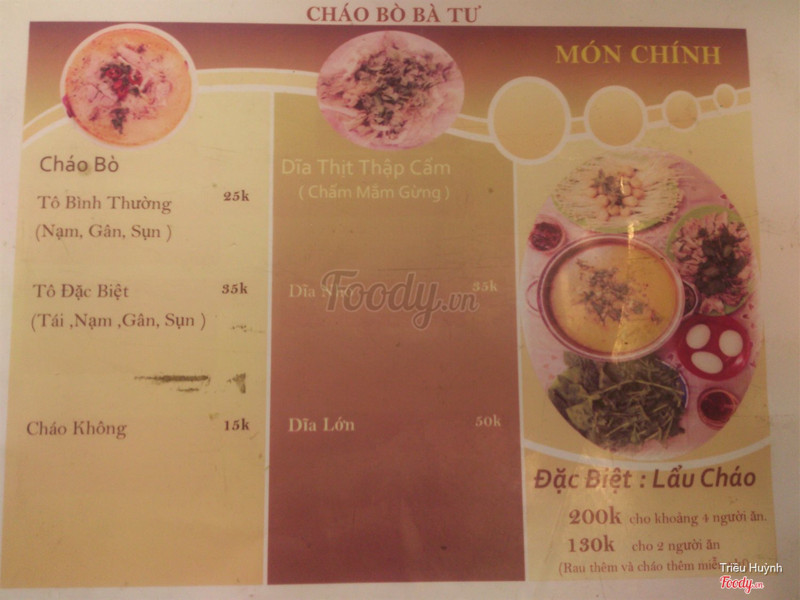 7.6CHÁO KHÁ NGON, THỊT BÒ SIÊU NHIỀUĐây là lần thứ 3 mình ăn món cháo bò Đà Lạt này. Cá nhân mình thấy tô cháo vị lạ, ăn khá ngon và chắc chắn rất bổ dưỡng vì mình có hỏi cô chủ quán thì được biết là cháo được nấu cùng nước lèo 100% thịt bò hầm như phở theo công thức gia truyền của quán. Bé con nhà mình lúc đầu k thích cháo chút nào nhưng ăn món này thì nó ăn nhanh và ăn hết sạch. Mình ăn cùng gia đinh ở đây 3 lần chỉ có 1 lần giữa cháo chưa ninh nhừ và không thơm lắm, vị hơi lạt còn 2 lần còn lại cháo nhừ, nấu đặc và rất thơm, béo vị bò nhưng không ngán, mà chắc do quán mới mở nên chất lượng chưa ổn định. Lần gần đây nhất ghé thì thấy quán đã đổi menu có thêm lẩu cháo ăn kèm nhiều rau và nấm, trứng lộn, thấy cái lẩu bàn bên ăn 130k mà nhiều khiếp, ăn được 3 người. Còn cháo thì ngoài tô bt 25k thì tô đặc biệt lên giá thành tới 35k rồi đó, nhưng có thêm bò viên và thịt tái quá trời, ăn thịt không cũng no rồi, giống bò cháo hơn là cháo bò^^. Tuy giá hơi cao nhưng nhiêu đó thịt bò thì thấy tô đúng đặc biệt rồi, nên lâu lâu cần bổ sung chất chắc chắn sẽ đưa gia đình tới đây. ...Xem thêm