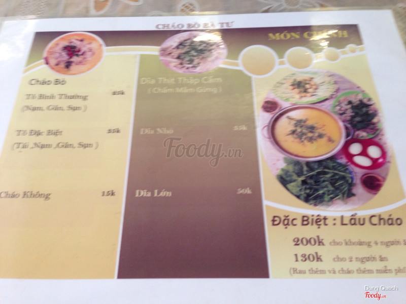7.0Cháo lạ ...Chiều ghé mua phần lẩu cháo 130k mang về... rau nhúng lẩu có cải cúc, rau muống, mồng tơi. Nấm thì có nấm kim châm vs nấm rơm. Thịt bò 1 hộp nhựa có sụn, vè, tái, gân, nước mắm gừng, sa tế, chanh ớt kèm theo... trong menu còn có các món ăn chơi khác ( xem menu kèm theo nha ^_^ ) Phong cách phục vụ đúng y người Đalạt gốc, mềm mỏng, nhẹ nhàng, điểm cộng cho chuyện này. Quán vắng, món chính là cháo bò và vài món ăn chơi vậy là đủ rồi. Thích hợp họp nhóm đông người, không sợ phiền ai. ...Xem thêm