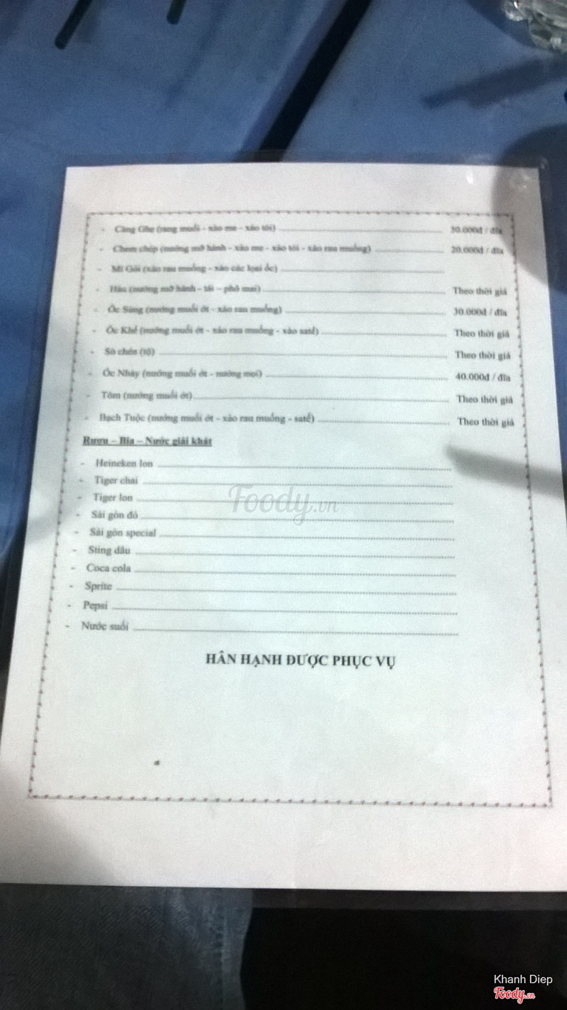 7.2Ốc Khánh - Thiên PhướcĐi với hội bạn, biết chỗ này lâu rồi nhưng chưa đi bao giờ, đi rồi mới thấy vị trí khó kiếm vãi, may có đứa biết dẫn đường. Vị trí: trong hẻm phải quẹo 2-3 lần mới tới, hơi khó tìm, lần đầu đi thì nên đi chung với người biết trước. Không gian rộng rãi, đơn giản chỉ có bàn và ghế và bếp, hết. Thích hợp cho nhu cầu nhậu nhẹt các kiểu. Bàn ghế nhiều, không sợ thiếu chỗ. Chỉ có vấn đề là không đủ thoáng khí, nướng khói bay mù trời. Giá rẻ, menu nhiều món, có 1 số món mới và lạ, đặc biệt là con sam. Kêu 2 con ăn thử thì có 1 con bị thúi, phải đổi, nhưng nhìn chung là ăn khá ngon. ...Xem thêm