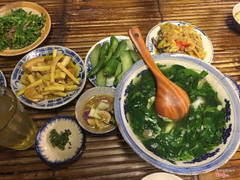 7.8Đồ ăn ngon, chấtGiờ mới có dịp ghé ăn thử sau mấy lần lỡ hẹn. Mình tới vào lúc 11h00 thứ 7, quán gần hết chổ ngồi, thêm 15p nữa thì kín chổ vì diện tích quán không lớn lắm với khoảng 10 bàn hay 40 người thôi. Cơm nấu chung với sắn cắt lát mỏng thơm và dẻo được để luôn trong niêu lớn. Cà nấu với thịt khá ngon, canh chua đậm vị, cá kho thì hơi cay. Có thêm dĩa thịt cắt lát mỏng chấm với nước mắm thêm ăn kèm rau sống ngon lành. Mỗi suất 50k, đi 5 người thì có thể gọi 4 suất nếu thiếu cơm thì gọi cơm thêm với giá 10k. Ăn xong mỗi người được 1 trái chuối mật tráng miệng, ai thèm thì xin trái nữa. Trà đá hoàn toàn miễn phí, thơm vị gừng nên dễ uống. Decor quán theo kiểu xưa với dạng vách tre mái lá, bàn ghế tre thêm mấy cái đồ máy móc hồi xưa. Quán mở mấy bài nhạc có âm thanh như mấy bài trong phim tài liệu về chiến tranh được phát trên truyền hình. Ai chưa đi thì nên đi 1 lần cho biết, biết quán có gì và quan trọng hơn là biết thời chiến tranh ông cha ta đã gian khổ thế nào dù phần cơm trên được đánh giá là lãnh đạo cấp cao thời đó mới có. ...Xem thêm