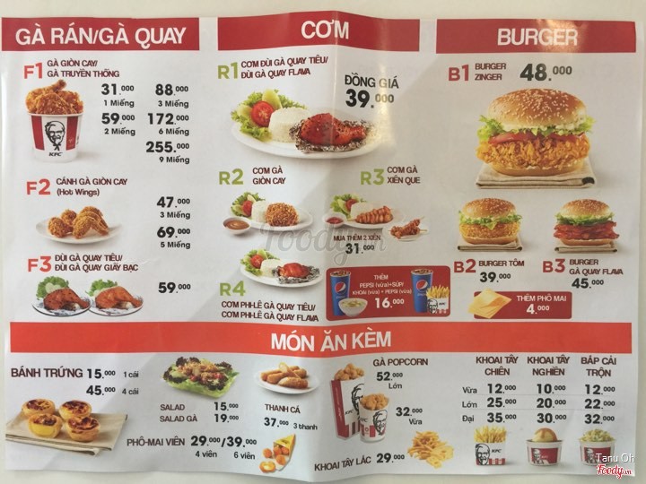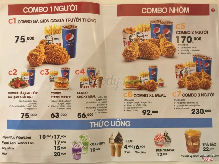 9.2KFCGà rán KFC đang có combo khuyến mãi cho suất ăn 2 người đó các bạn Suất 1 ( giá: 89.000đ) gồm: 1 phần gà rán đùi + 1 ly Pessi Suất 2 ( giá: 135.000đ) gồm: 1 phần gà rán đùi, cánh + 1 ly Pessi Suất 3 ( giá: 189.000đ) gồm: 1 phần gà rán đùi, cánh Lớn + 2 ly Pessi Đặc biệt: kem ly giá cực sốc chỉ 3.500đ/ly Hambuge giá 35.000đ cực ngon so với những nơi khác Các bạn nên tham khảo giá để chọn suất ăn cho phù hợp với mình nhé. Chúc các bạn ăn ngon miệng! ...View more