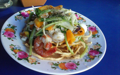 Tóc TímThị trấn bé nhỏ, có duy nhất 1 tiệm mì xào giòn. Cũng may mắn là nấu ngon, chứ không là thấy cảnh chết đói ở đây rồi, giá 30k 1 dĩa, mì thêm 5k, có thịt, tim, gan, mực, tôm, củ cải đỏ, cải, bắp cải trắng, tím, bông cải. chung là ngon, đẹp mắt. vị chua chua ngọt ngọt. Thỏa lòng ăn uống ở đây
