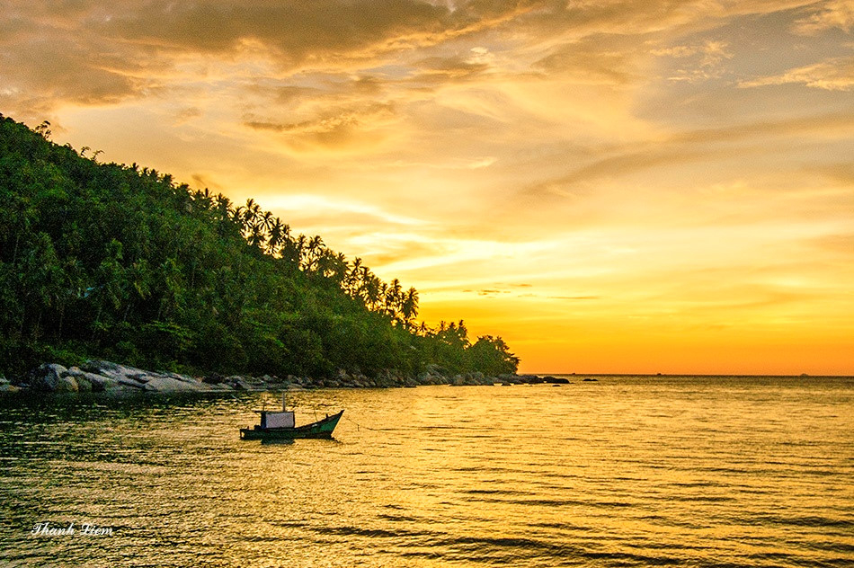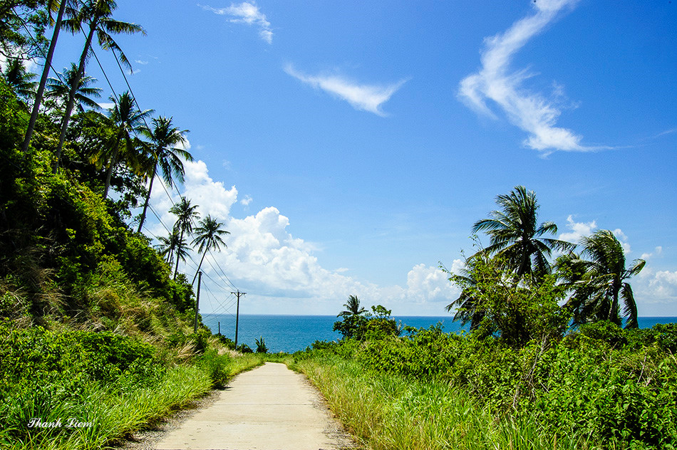 Con đường quanh đảo với chu vi 16 km, quanh co uốn lượn theo bờ biển với những rặng dừa nghiêng soi bóng dưới làn nước biển xanh ngắt, khiến bạn vô cùng thích thú.