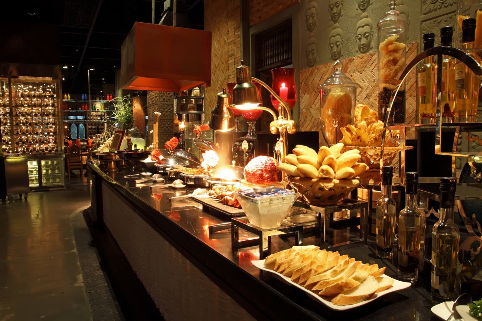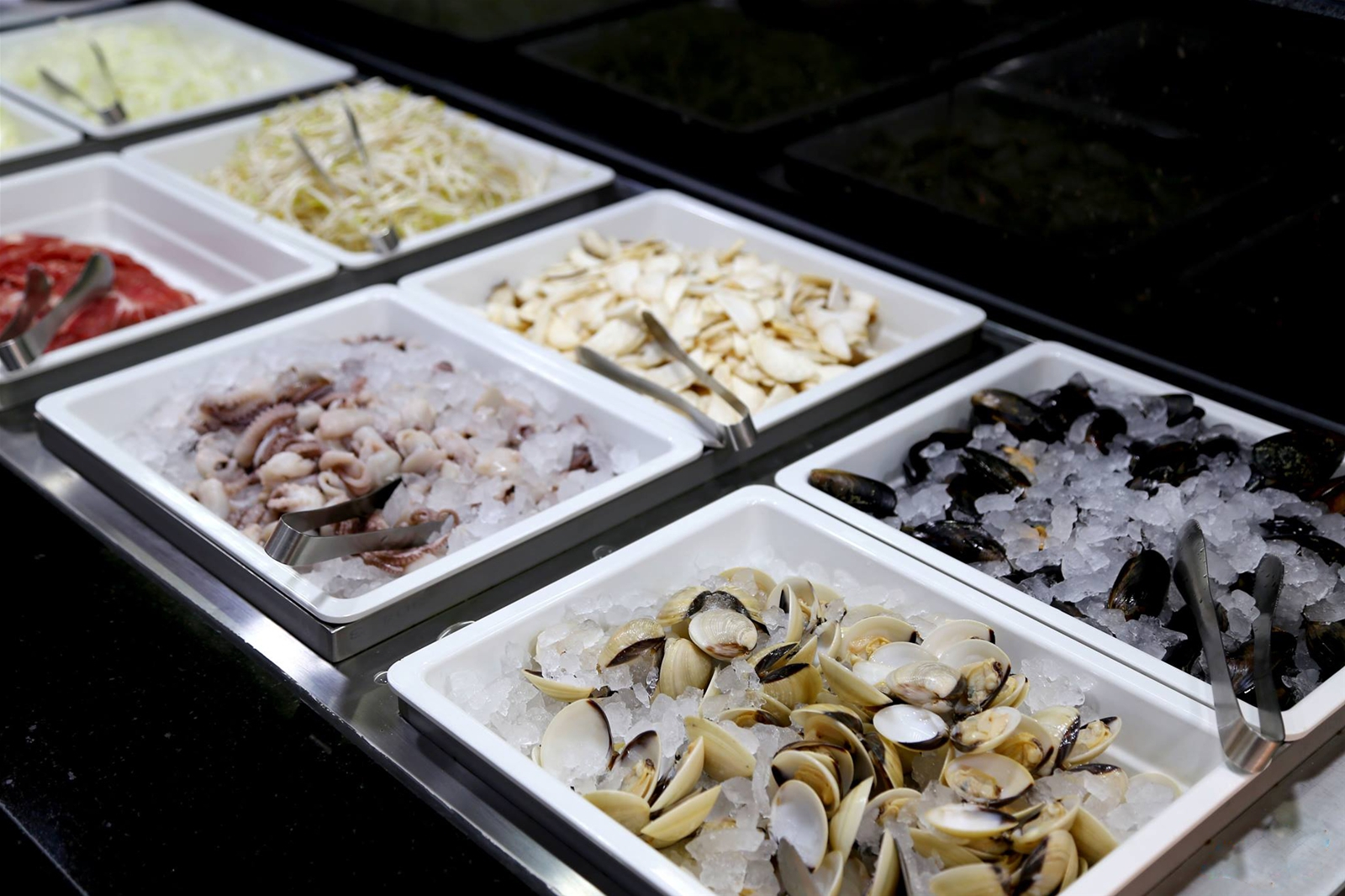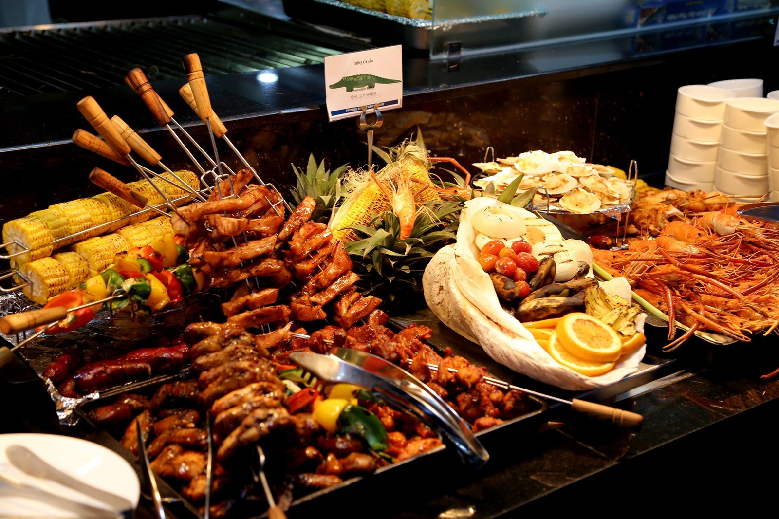 Sáu khu vực bài trí thức ăn với sự giao thoa hoàn hảo của nền ẩm thực quốc tế và đương đại trong thực đơn tự chọn hơn 100 món, tôm càng đất xốt Louisiana, vẹm jumbo, cá kiếm hấp xốt bào ngư, nghêu hấp sả, ốc bưu hấp Thái, sashimi, xiên que nướng, tempura và còn rất nhiều món ngon đặc sắc đang chờ đợi bạn.