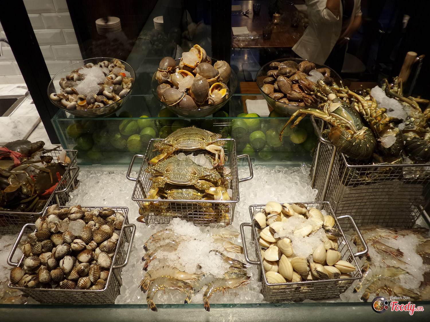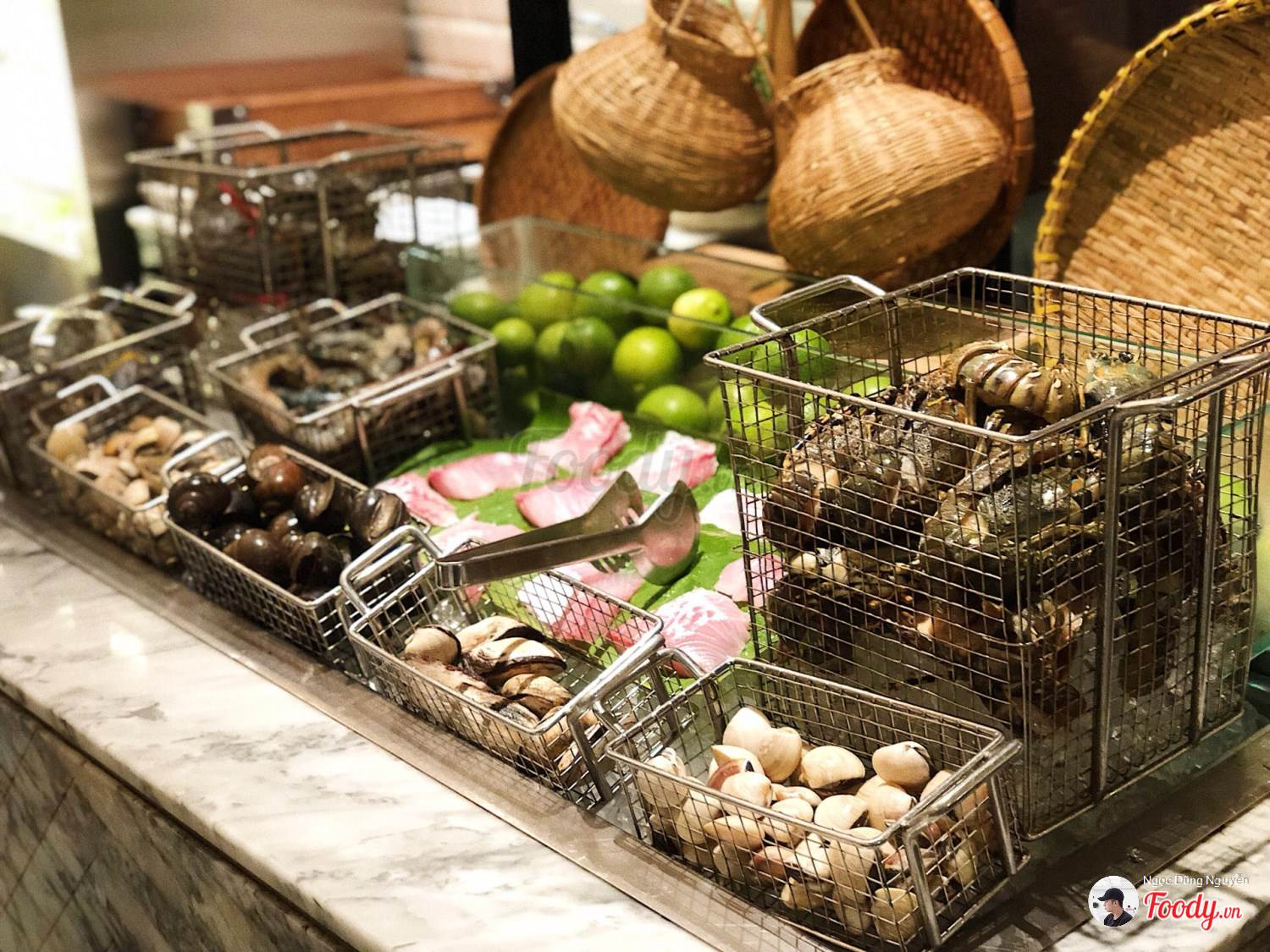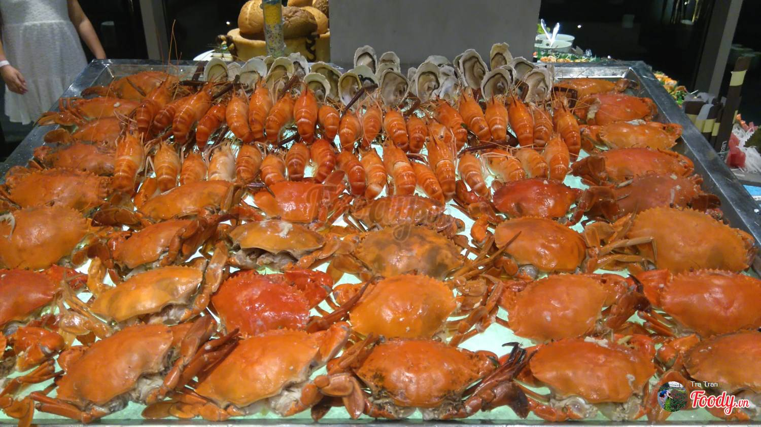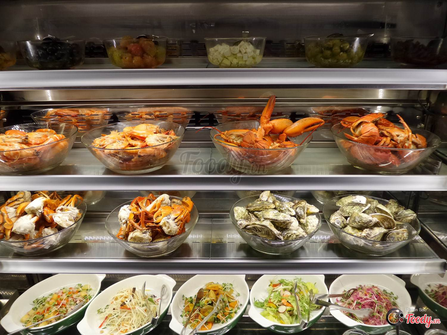 Sau đó tụi mình bắt đầu ra quầy lấy thức ăn, ấn tượng nhất chính là quầy hải sản tươi rói của nhà hàng với đủ các loại hải sản phong phú như tôm hùm, tôm mũ ni, tôm sú, cua, ghẹ, hàu sống và hàu nướng phô mai chế biến sẵn cùng rất nhiều loại sò ốc khác như sò điệp, sò huyết, sò lông, ốc mỡ..v.v. Ảnh: Foody
