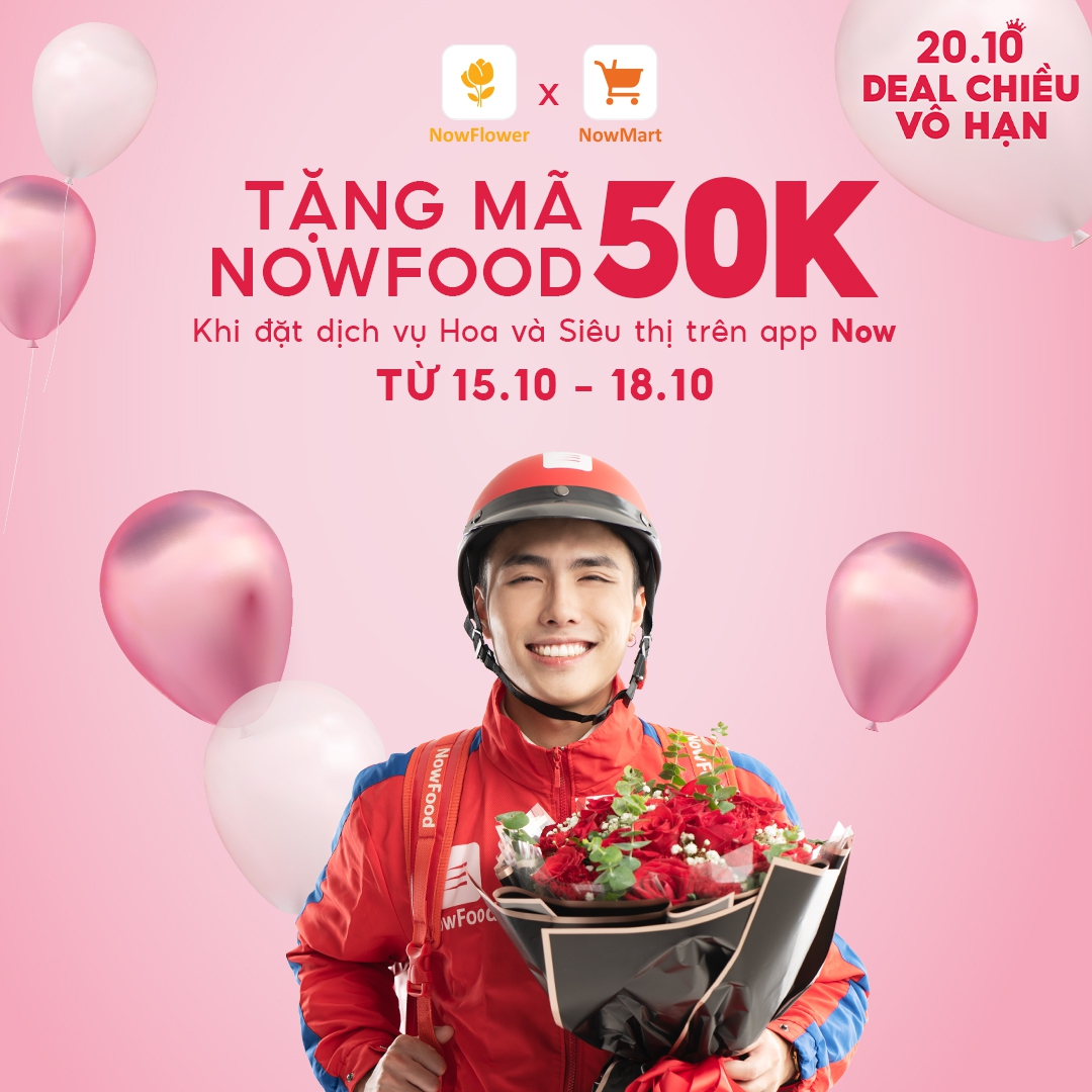 Từ 15/10 - 18/10, khi đặt trước hoa và quà tặng (mỹ phẩm) trên app Now (mục Hoa hoặc Siêu Thị), bạn sẽ nhận ngay mã một mã NowFood GIẢM 50K. Nếu nàng muốn “lãng mạn phải có, mà vẫn muốn no” thì khỏi cần suy nghĩ rồi nhé. Mã NowFood sẽ được gửi đến bạn vào ngày 20/10. Vừa có hoa, có mỹ phẩm lại có đồ ăn thì nàng nào cũng thích mê luôn đó.