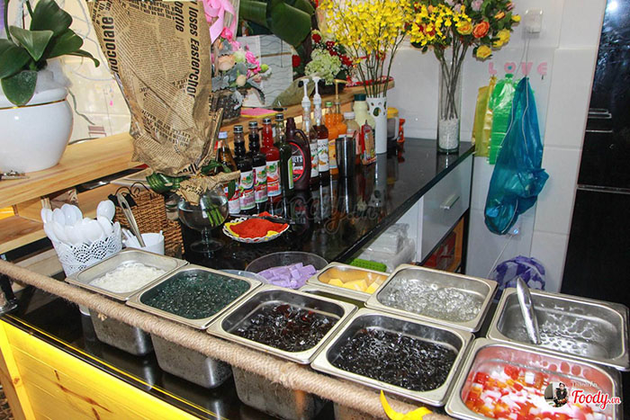 Topping có các loại thạch Đài Loan thần thánh gồm: hạt ngọc trai, thạch dừa sợi, thạch ống thủy tinh, cream cheese… và các loại thạch nhà làm như: thạch rau câu, khúc bạch, popping yogurt, thạch phomai… tha hồ lựa chọn để nhâm nhi cùng ly trà sữa mát lạnh nhé!