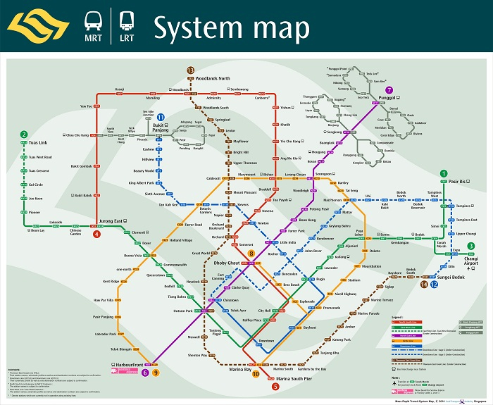 Hiện nay có tổng cộng khoảng 5 tuyến MRT, 3 tuyến LRT và 1 tuyến Sentosa Express, ở bài viết này mình chỉ đề cập đến MRT và tuyến Sentosa Express vì nó di chuyển đến hầu hết các điểm du lịch ở Singapore