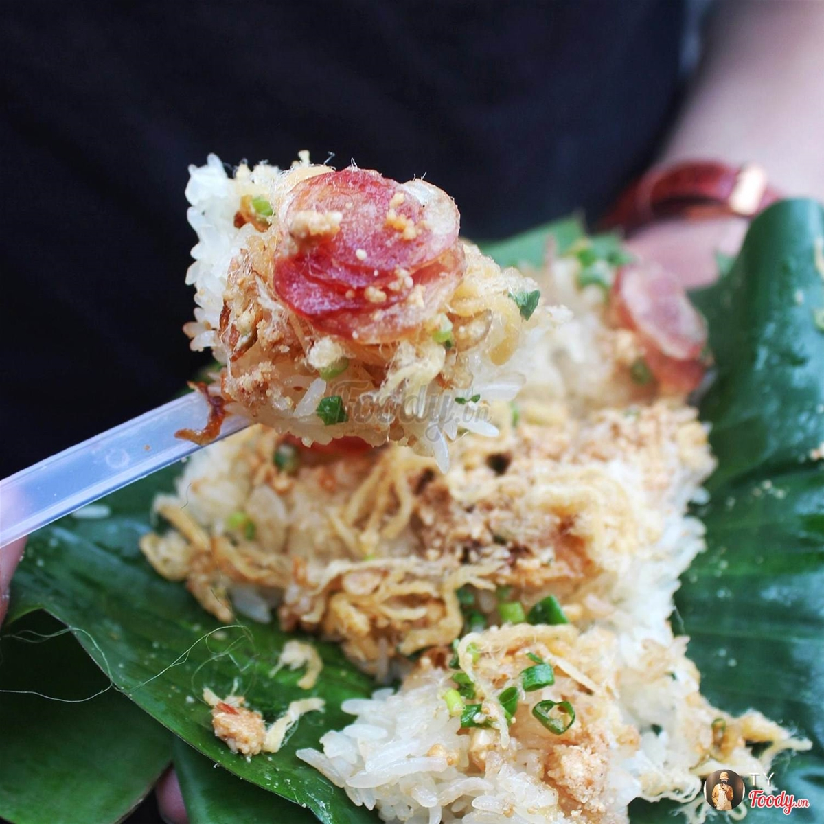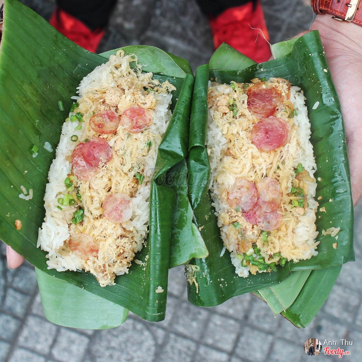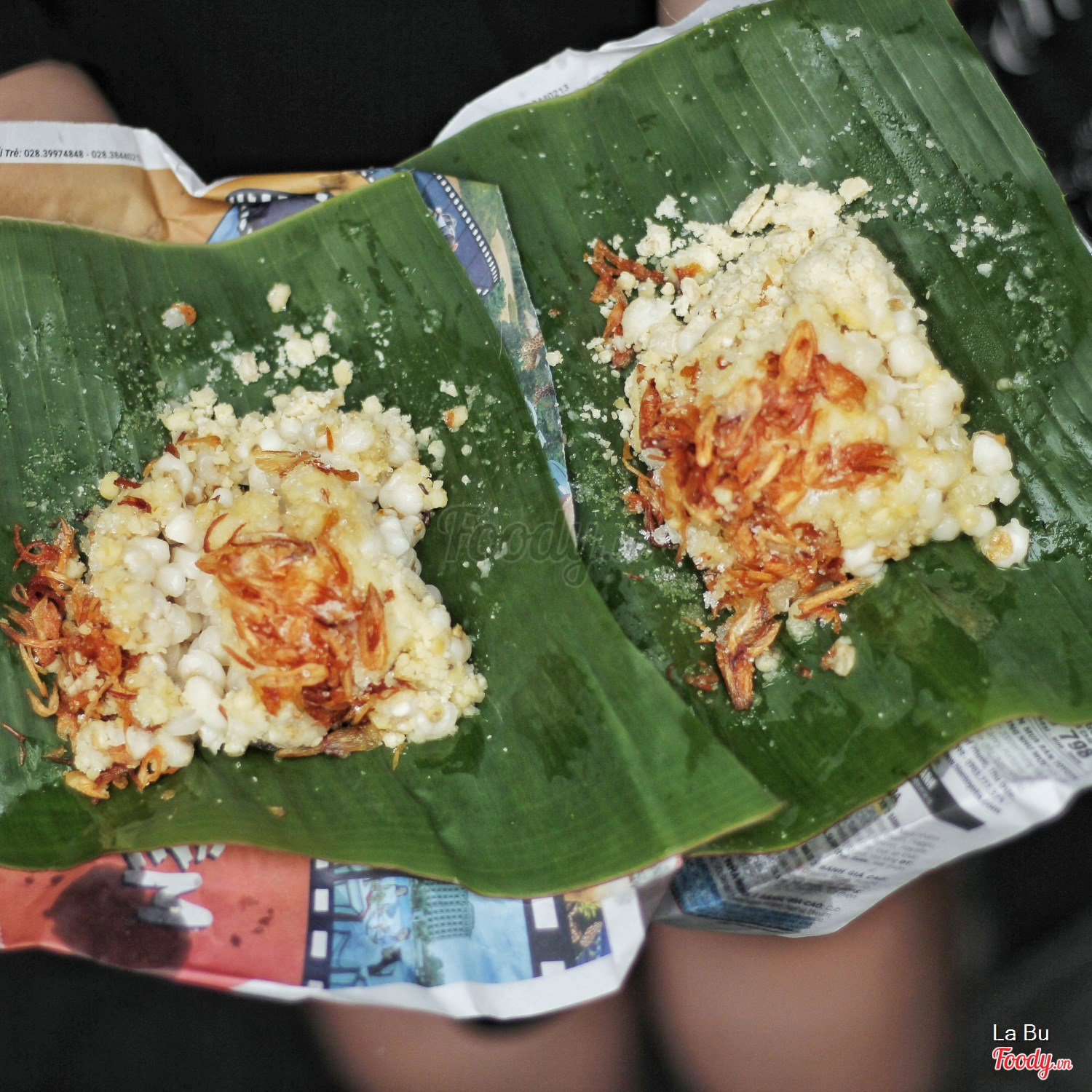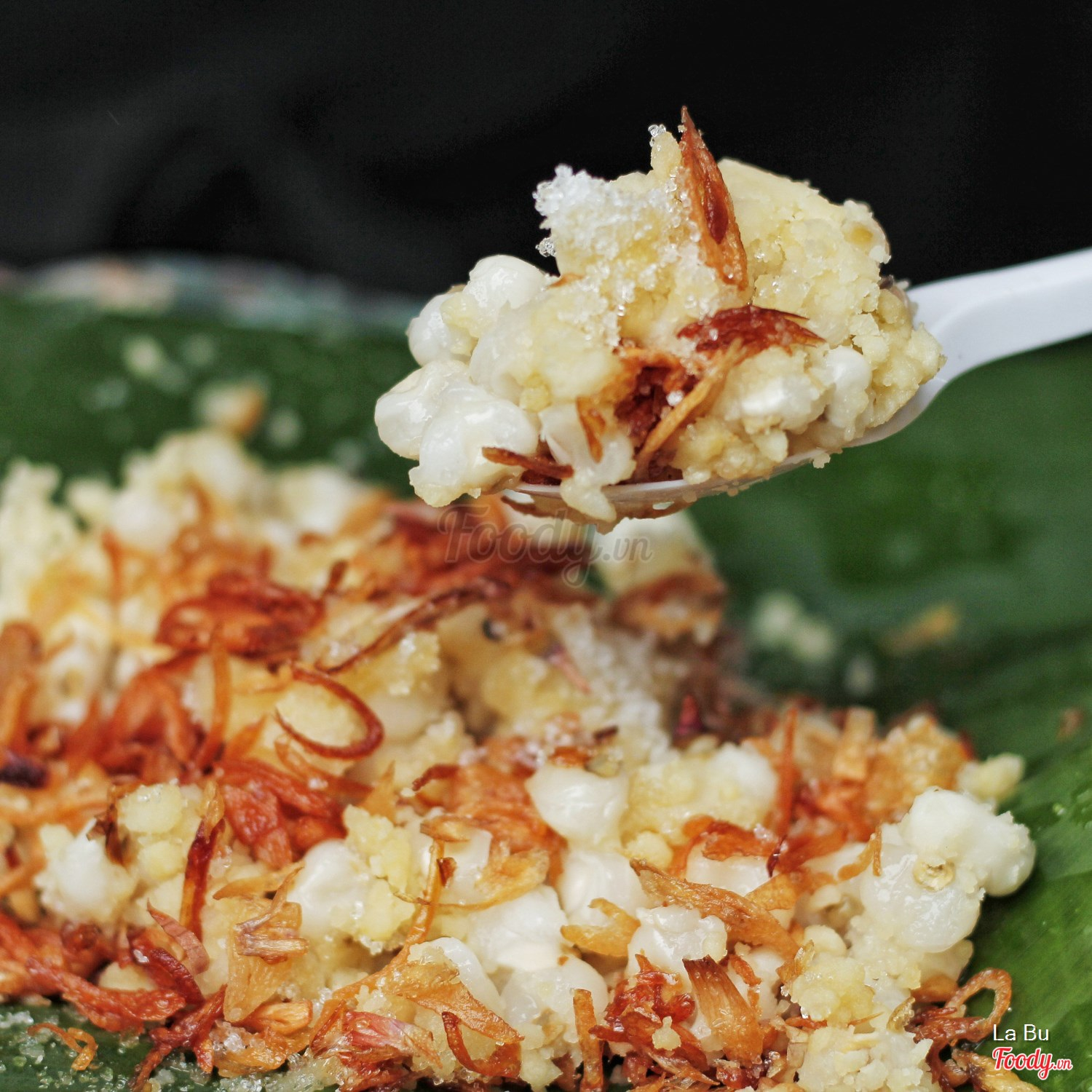 Xôi trong lá chuối, hạt bắp dẻo, nguyên hột chứ không bị nát, đậu xanh cũng nhuyễn mịn, hành phi rất giòn, vàng ươm, không bị gắt dầu, đường cát được để riêng, khi nào ăn mới rắc vào gói xôi rồi trộn đều lên, ngon hết sẩy.