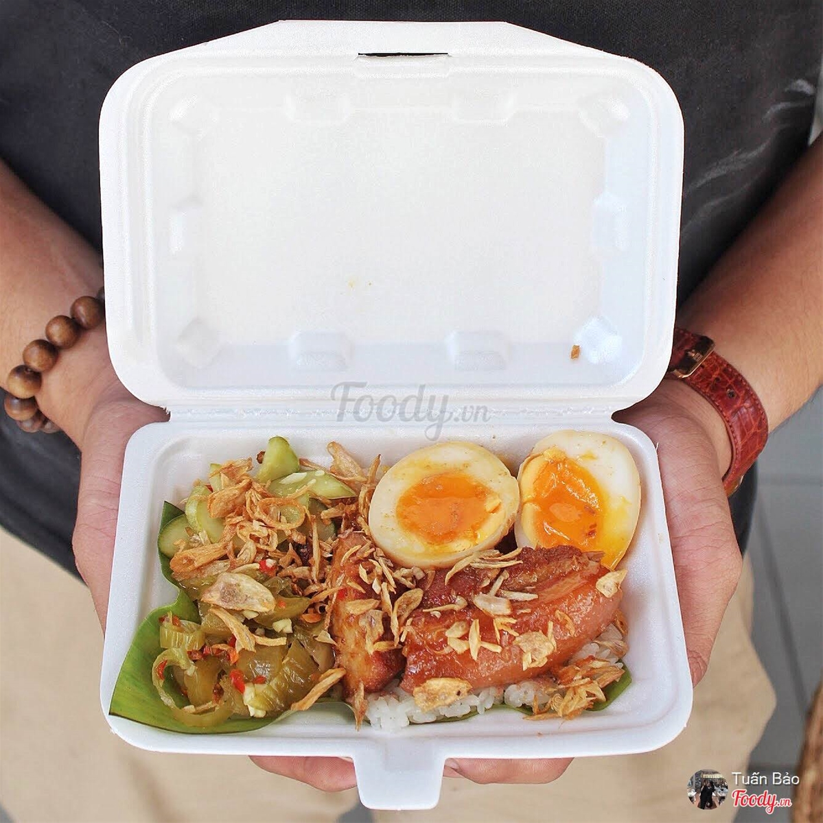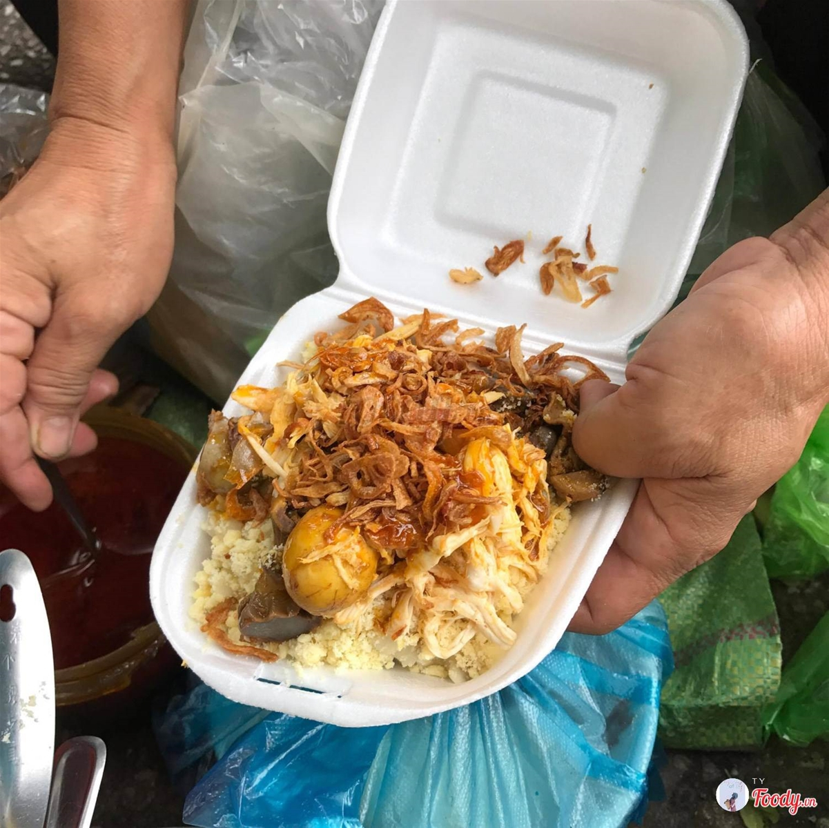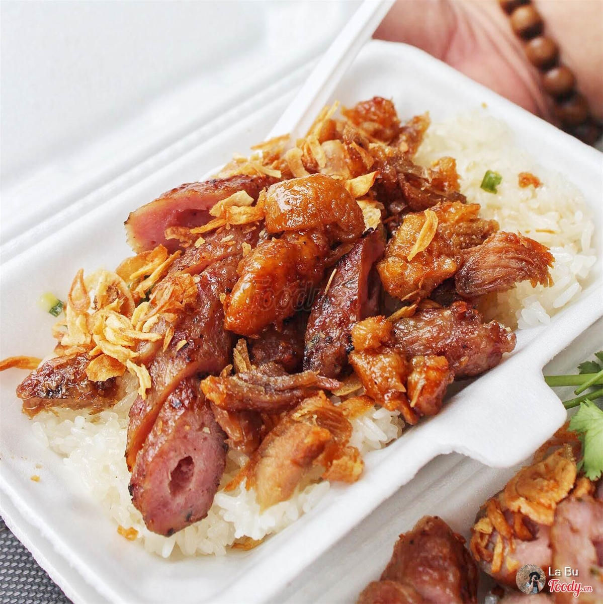 Nói xôi thịt quay vậy thôi chứ nhiều loại thịt lắm, vịt quay, heo quay nè, có cả lòng vịt nữa, một hộp xôi bao đã luôn vì khá nhiều thịt, thịt đã thấm vị rồi còn được chan thêm xí nước sốt vô xôi nữa là vừa ăn.