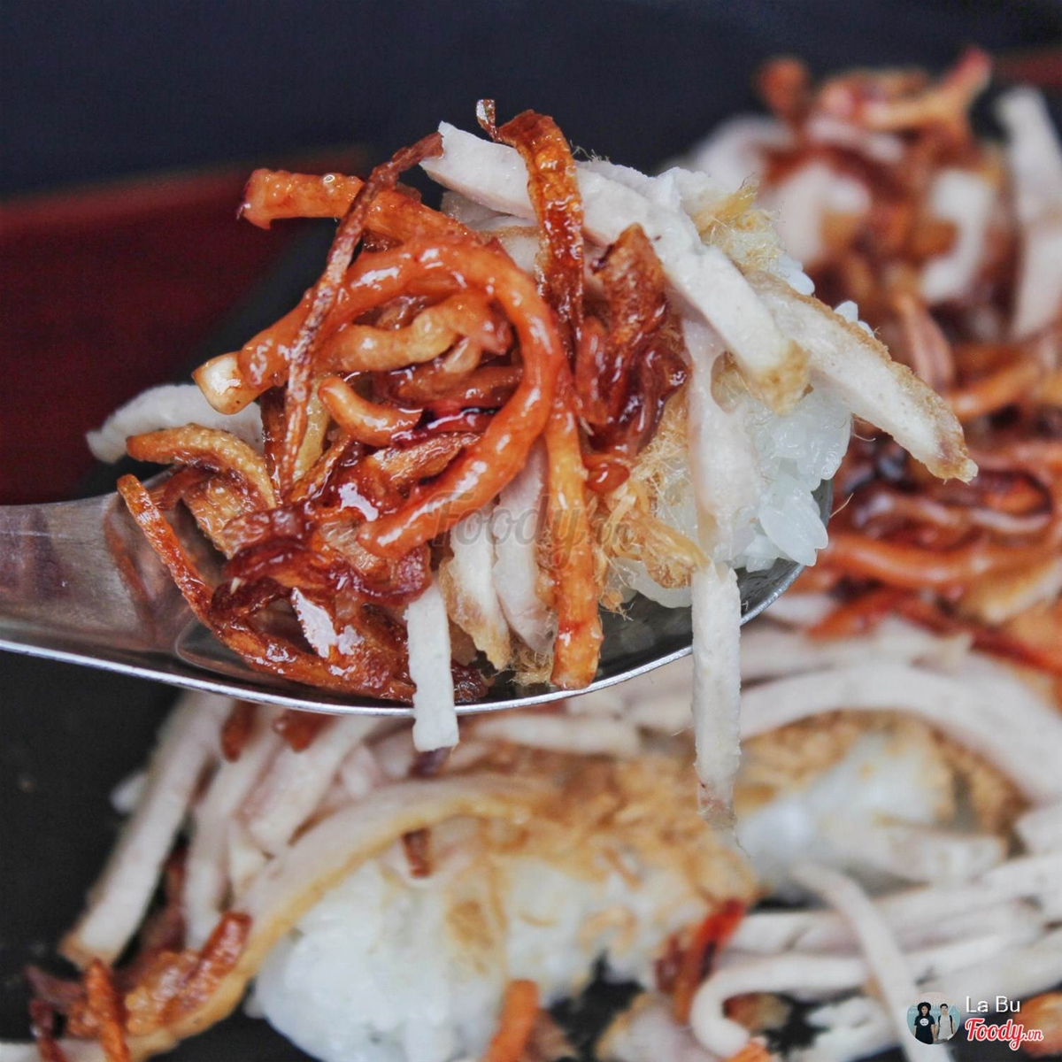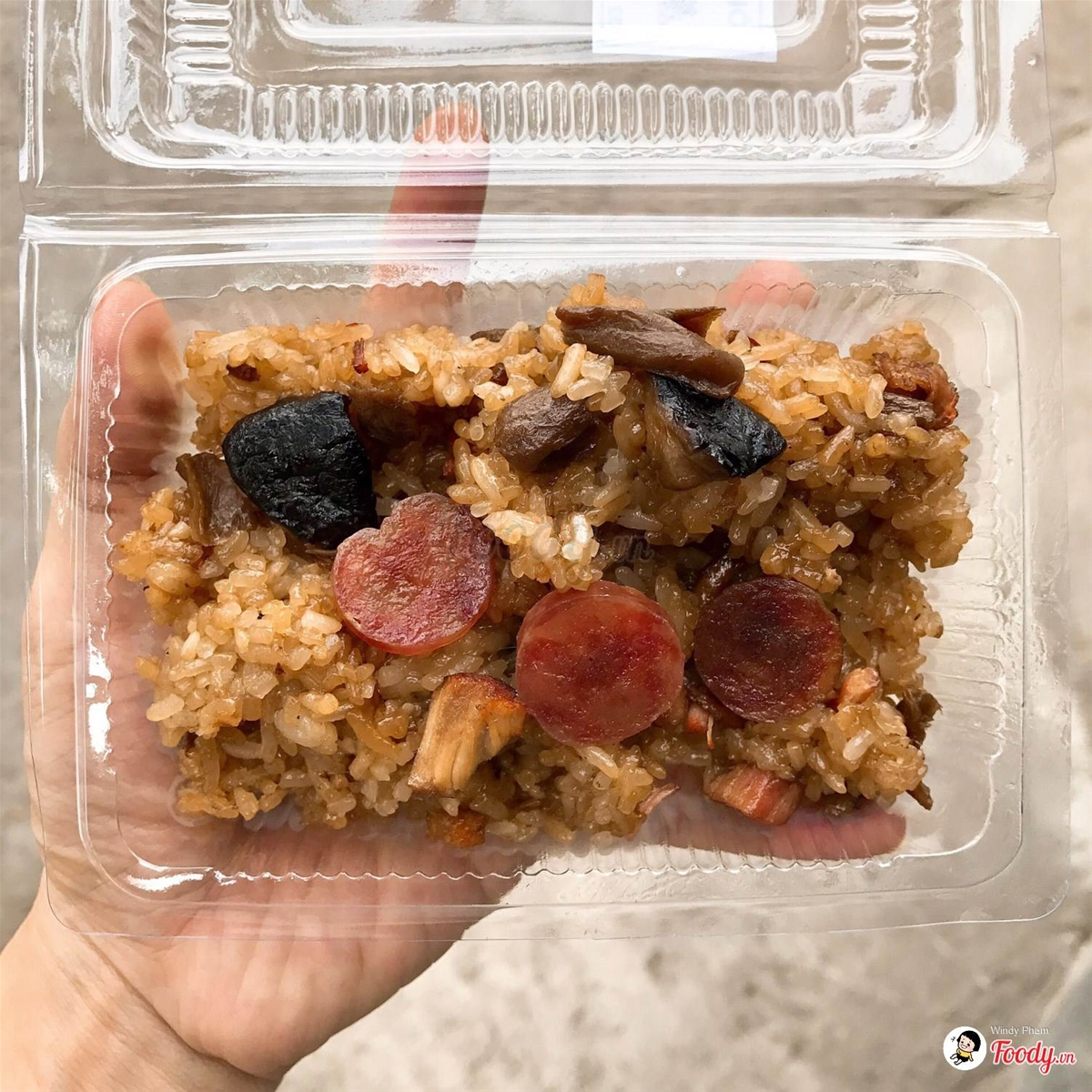 Xôi này thấy lạ lạ, kiểu như phim Hong Kong ấy, hộp xôi với 8 vị: xá xíu, lạp xưởng, tôm khô, củ cải, nấm đông cô, hành phi, đậu phộng tất cả hoà quyện với hắc xì dầu tạo nên màu xôi cánh gián khá là đẹp mắt.