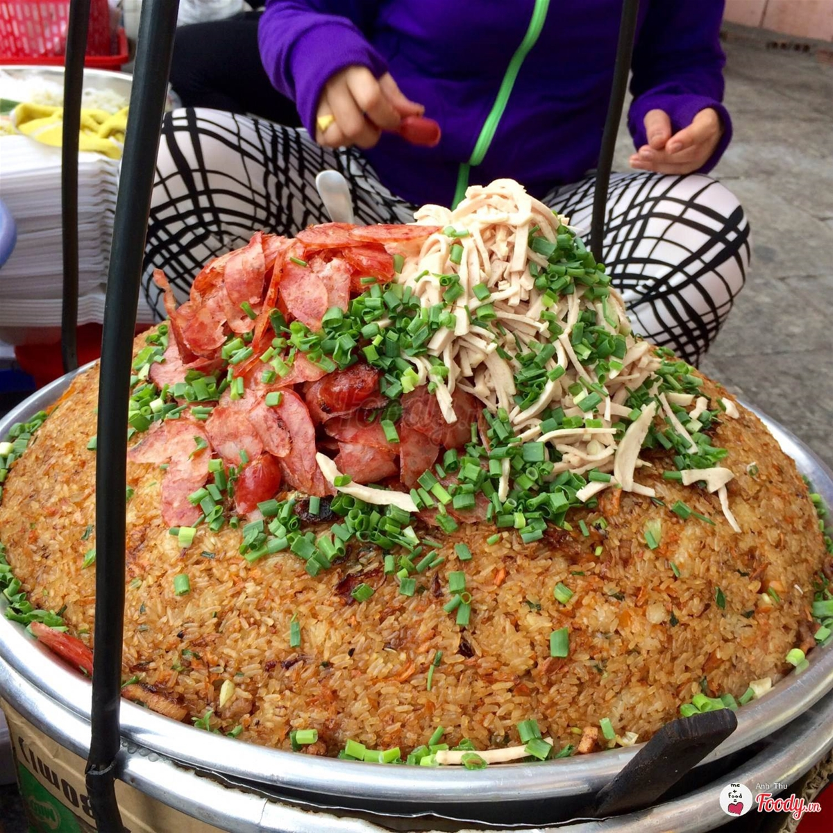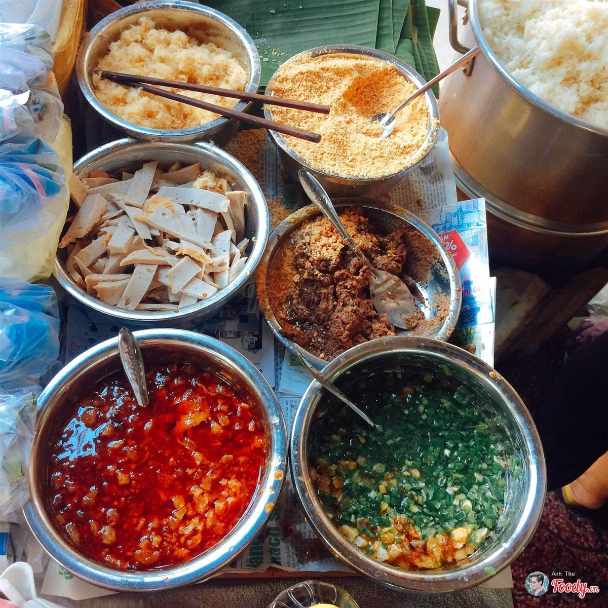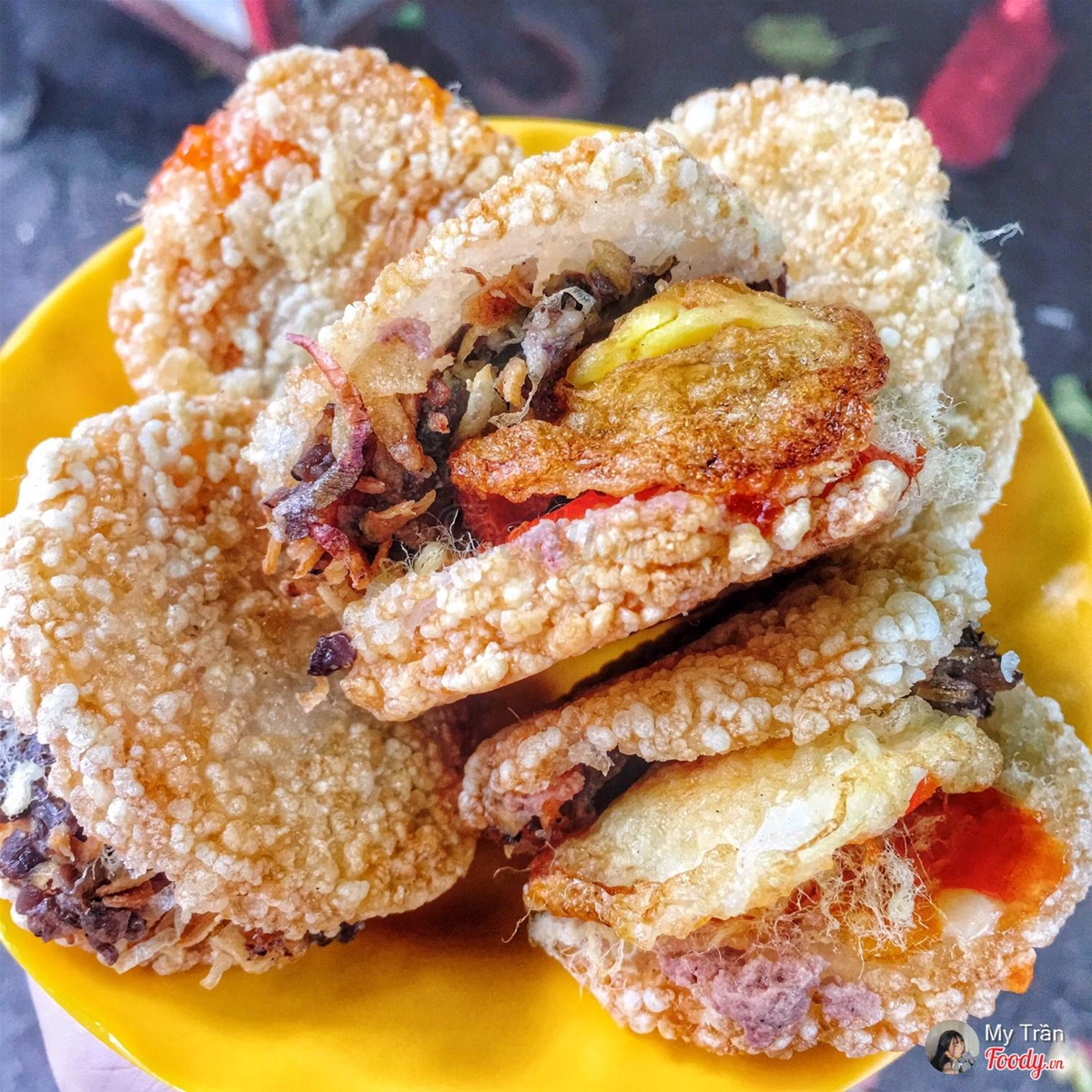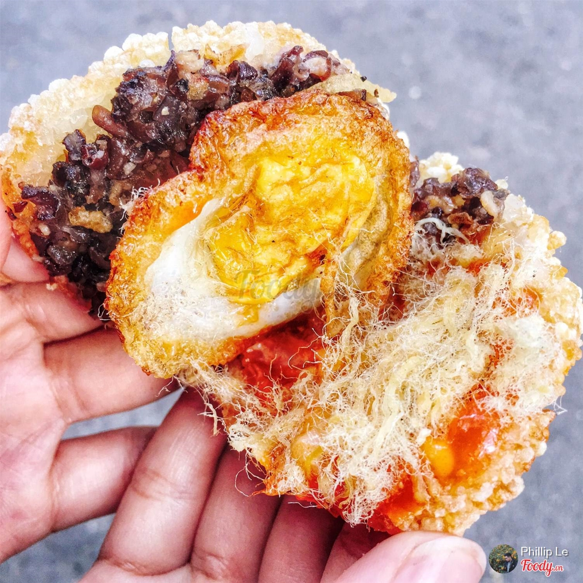 Chỉ 5k là có ngay miếng xôi chiên giòn rụm to đùng, topping thịt heo, nấm mèo, chà bông, rồi có nguyên cái trứng cút chiên nữa chứ, ai ăn cay xịt thêm tương ớt vô, ăn cỡ 2 miếng là ăn no cành hong luôn.