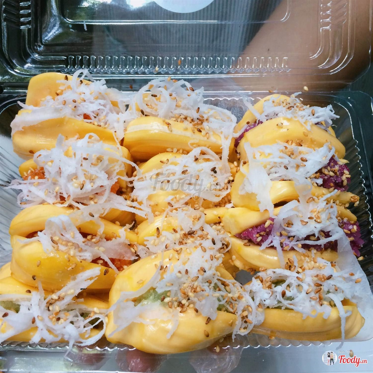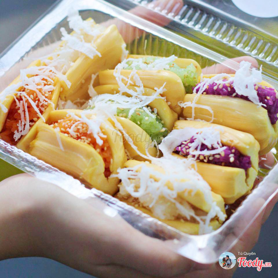 Có 4 vị xôi để lựa chọn lá dứa, lá cẩm, gấc, sữa dừa. Xôi được vo thành cục nhỏ rồi nhồi vào múi mít vàng óng, xôi dẻo, mít giòn sực sực, trên mỗi miếng xôi mít có dừa, trước ăn thì rưới nước cốt dừa lên ăn vừa béo vừa thơm.