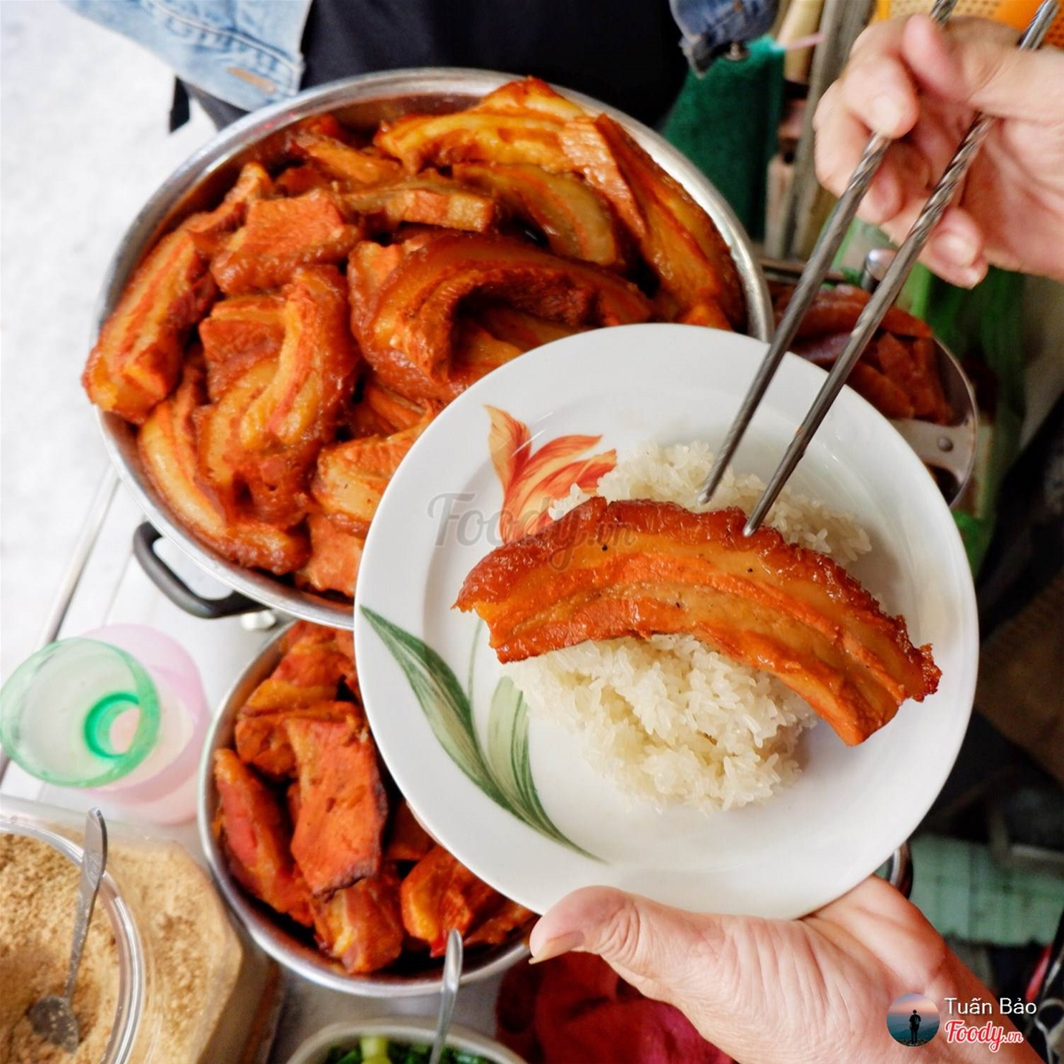 Nguyên miếng thịt ba rọi được chiên giòn phần mỡ, nhìn có vẻ cứng nhưng ăn lại mềm, không khô tẹo nào vì phần mỡ đã thấm vào từ thớ thịt, ăn chung với xôi dẻo nóng hổi, rắc thêm chút đậu phộng đập nhuyễn bùi bùi rất ngon.