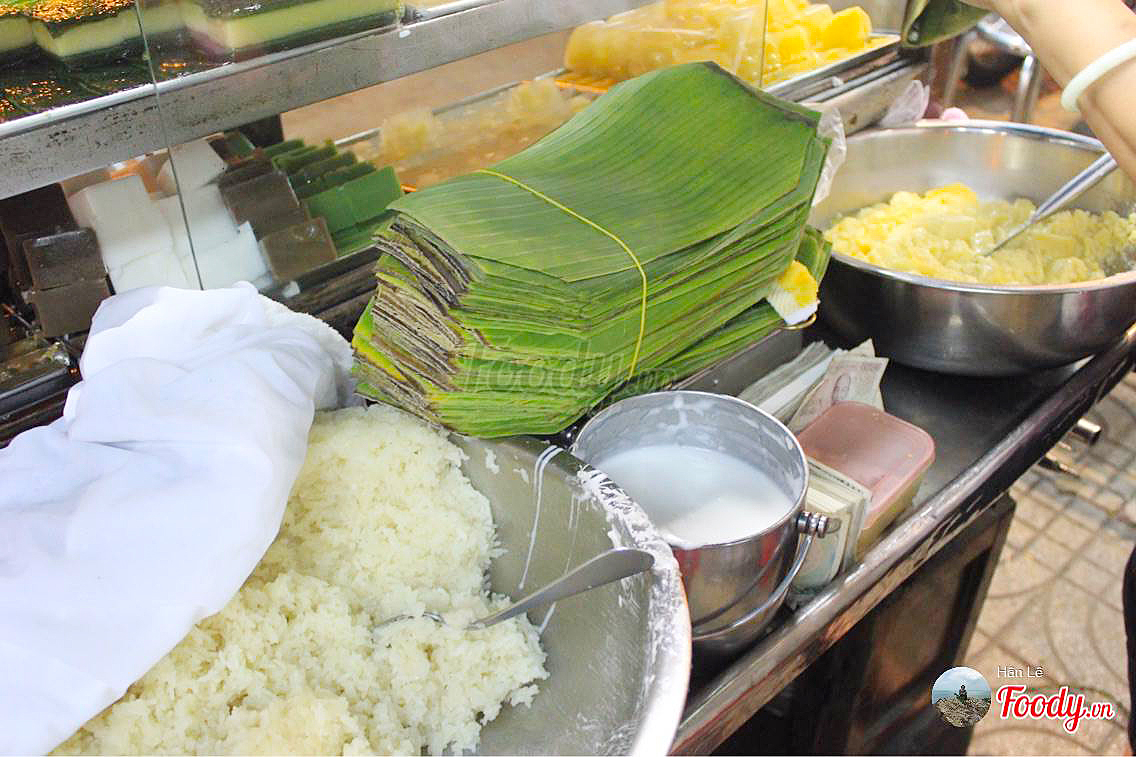 Xôi lúc nào cũng nóng hổi, dẻo, béo ngậy của nước cốt dừa, ngọt của cadé bên trên, rất ngon, được gói trong lá chuối nên vị khá đặc biệt, rau câu từng cục cũng ngon mà lạ nữa, rau câu củ năng, rau câu nhãn nhục…
