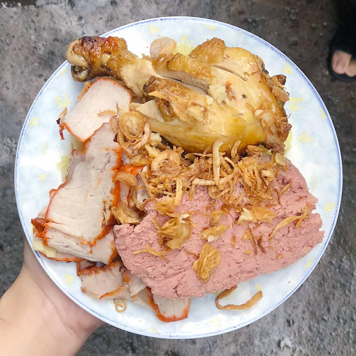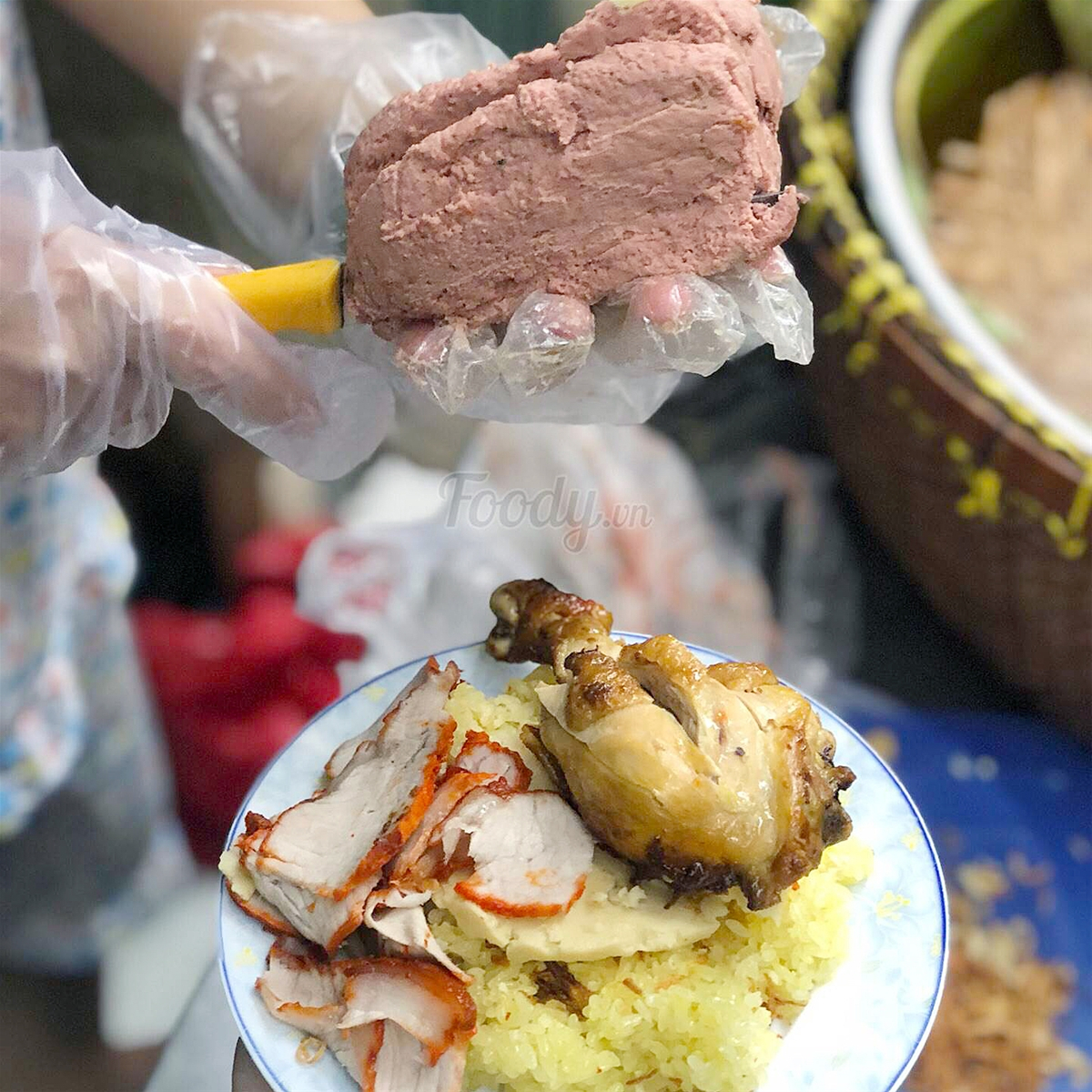 Một dĩa xôi đầy ụ với nguyên cái đùi gà, những lát xá xíu dày cui, nguyên miếng pate bự chảng, ăn no căng bụng.