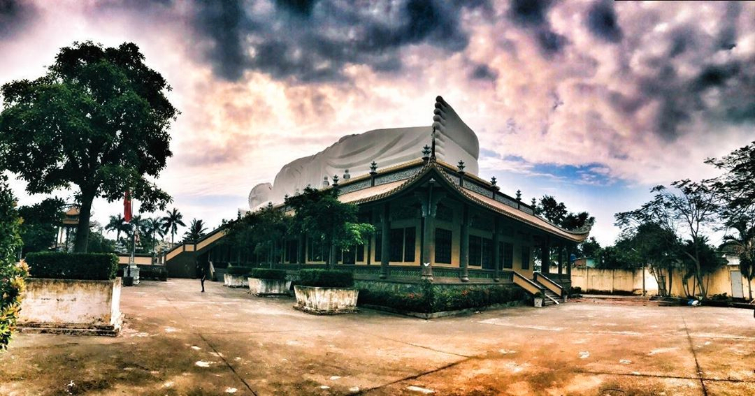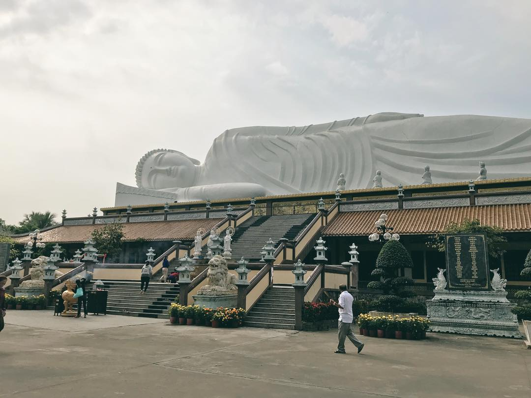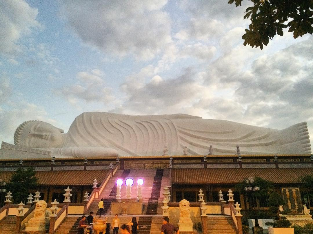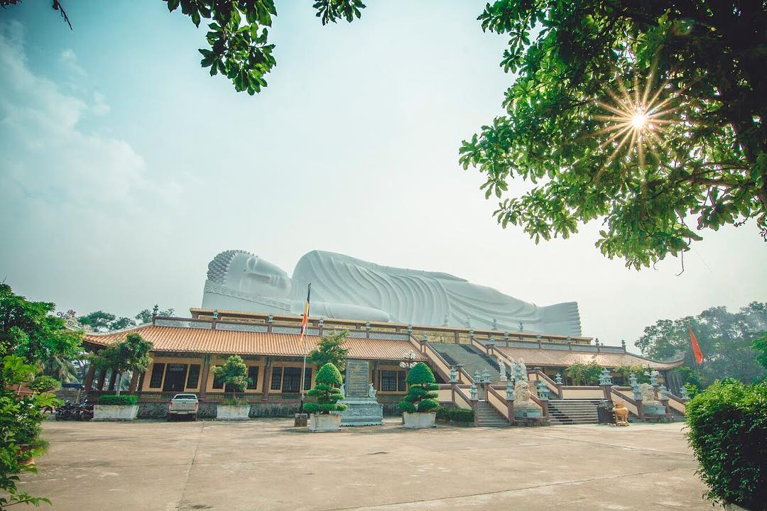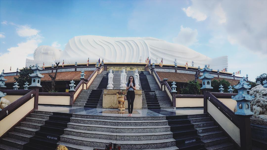 Công trình nằm trong khuôn viên rộng 13.000 m², được công nhận là tượng Phật nằm dài nhất Việt Nam. Bức tượng cũng được Tổ chức Kỷ lục châu Á xác lập là "Tượng Phật nhập Niết bàn trên mái chùa dài nhất châu Á". Ảnh: Kim Tuyen trên Instagram