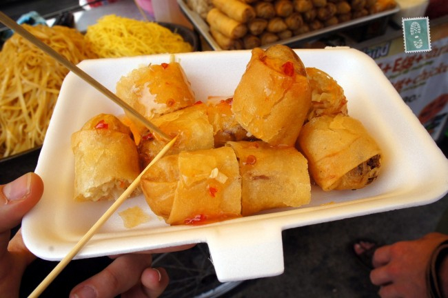 Là món ngon Thái Lan nổi tiếng, chả giò Thái được rán với dầu nên bạn sẽ cảm nhận độ giòn tan và hương vị tuyệt vời khi ăn. Món ăn cuốn trọn rau và thịt, ngoài ra bạn có thể thêm đậu hũ và tôm tùy chọn. Bạn có thể tìm thấy món ăn này ở tất cả các xe đẩy thức ăn cũng như trong các nhà hàng tại Thái. Nó thường được phục vụ với rau và nước sốt cay .